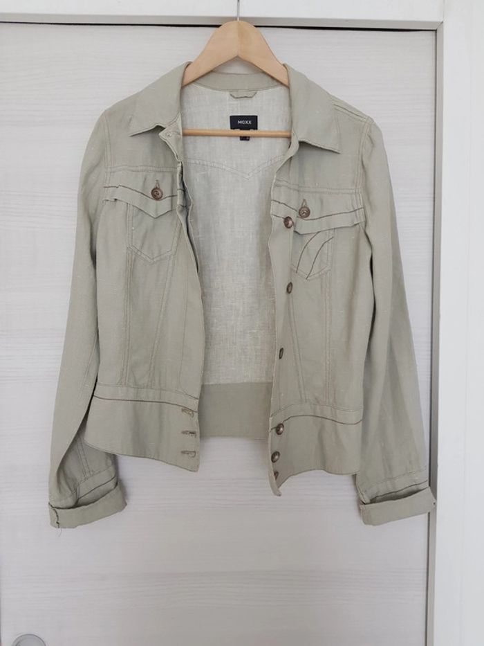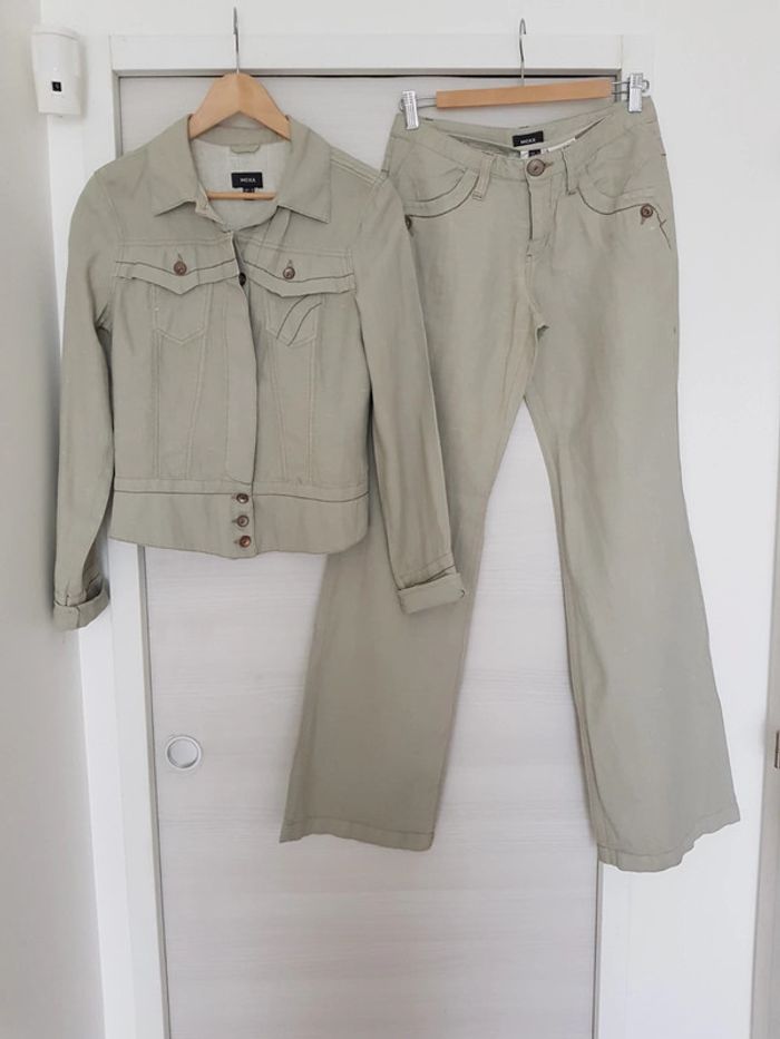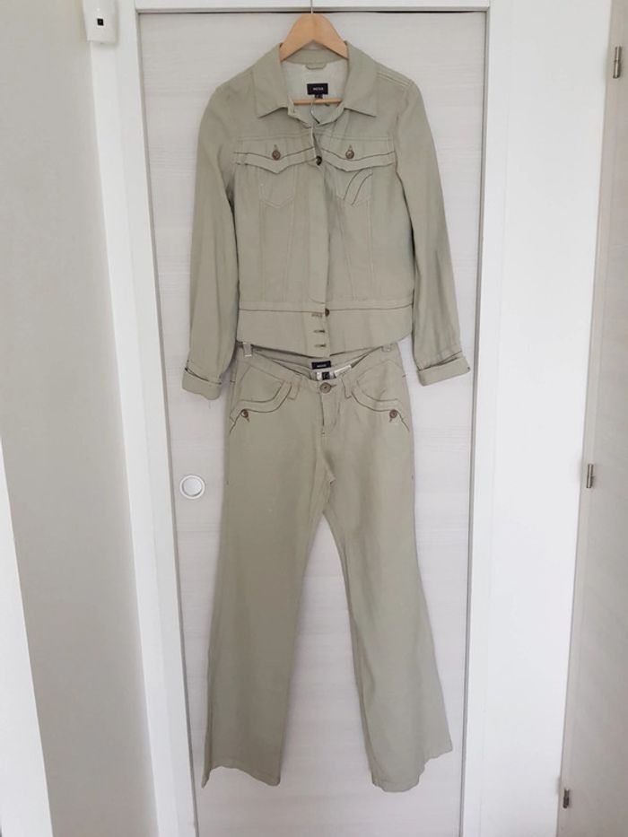Jolie tailleur 100% lin. Pantalon jambes évasées sur le bas. Couleur difficile à dire entre le beige et kaki très clair 🤔