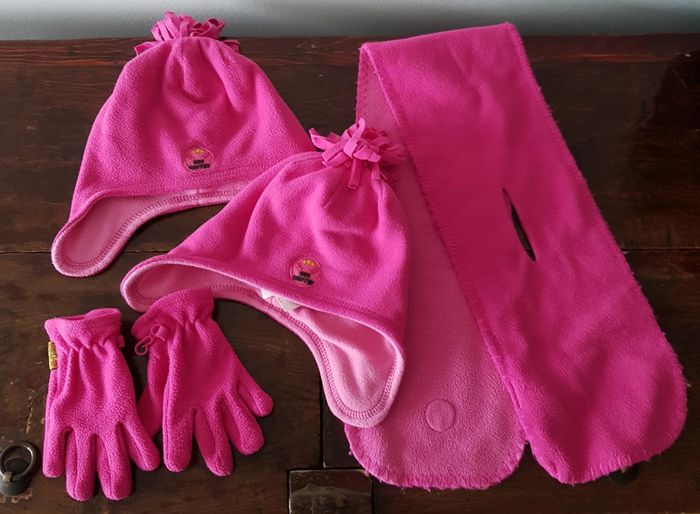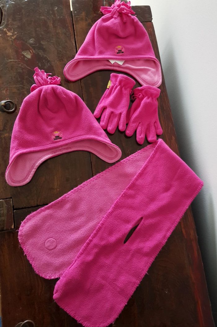 Polaire bien chaud, fille de 2 à 5 ans 2 bonnets taille 50cm et 53 cm Écharpe taille unique, gants taille 1