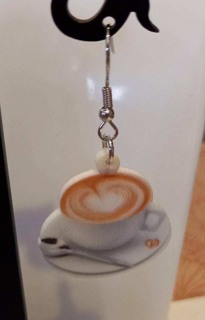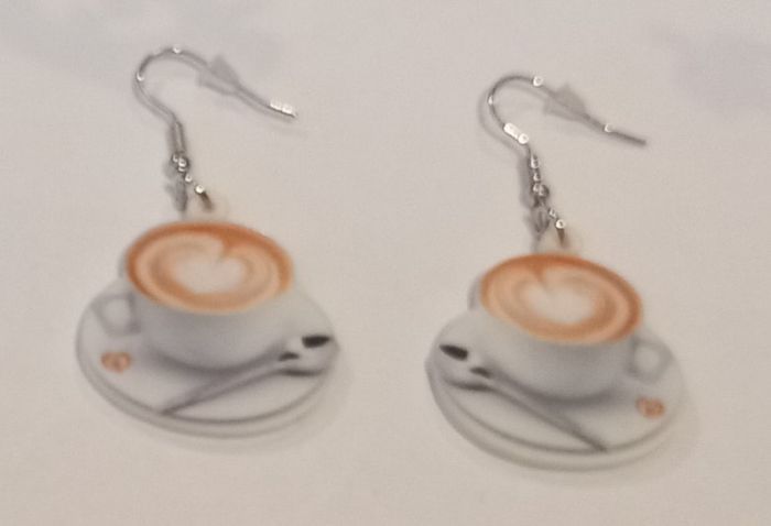 1 jolie paire de boucles d'oreilles originale en forme de tasse à café cappuccino. Hauteur : 5 cms. Largeur : 2,8 cms. Les boucles d'oreilles sont imprimées recto verso. Boucles d'oreilles neuves sous blister. N'hésitez pas à regarder mes autres ventes. Envoi rapide et soigné.
