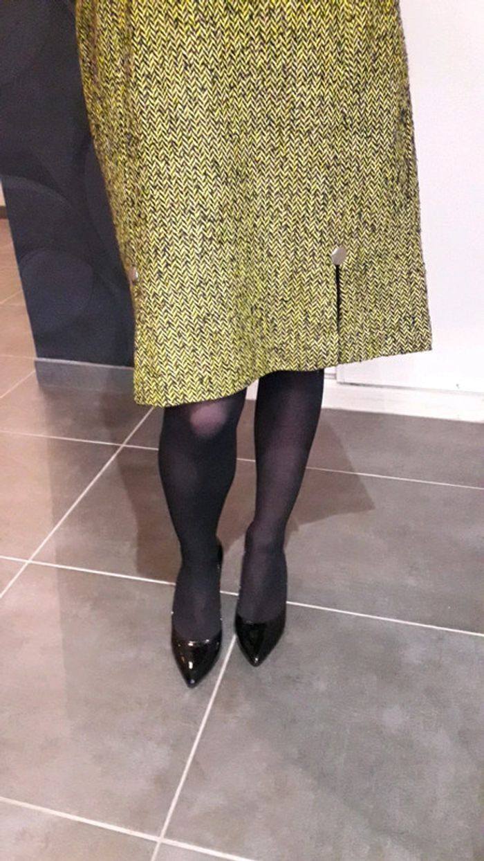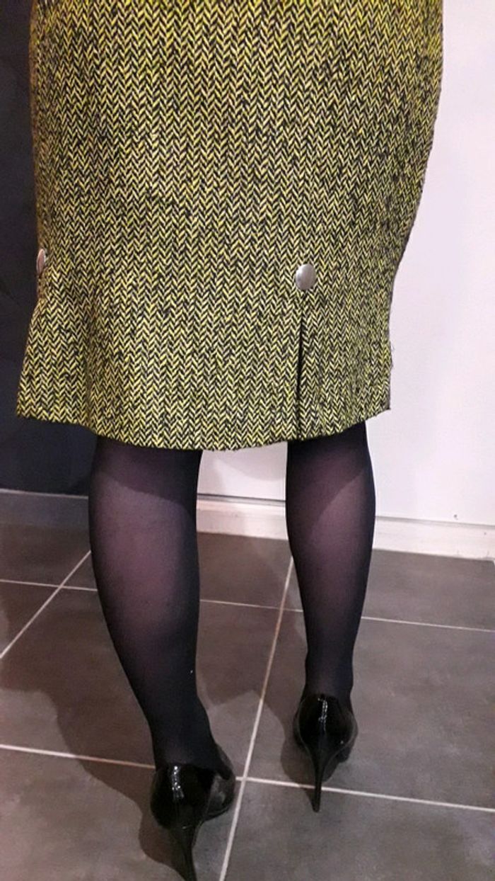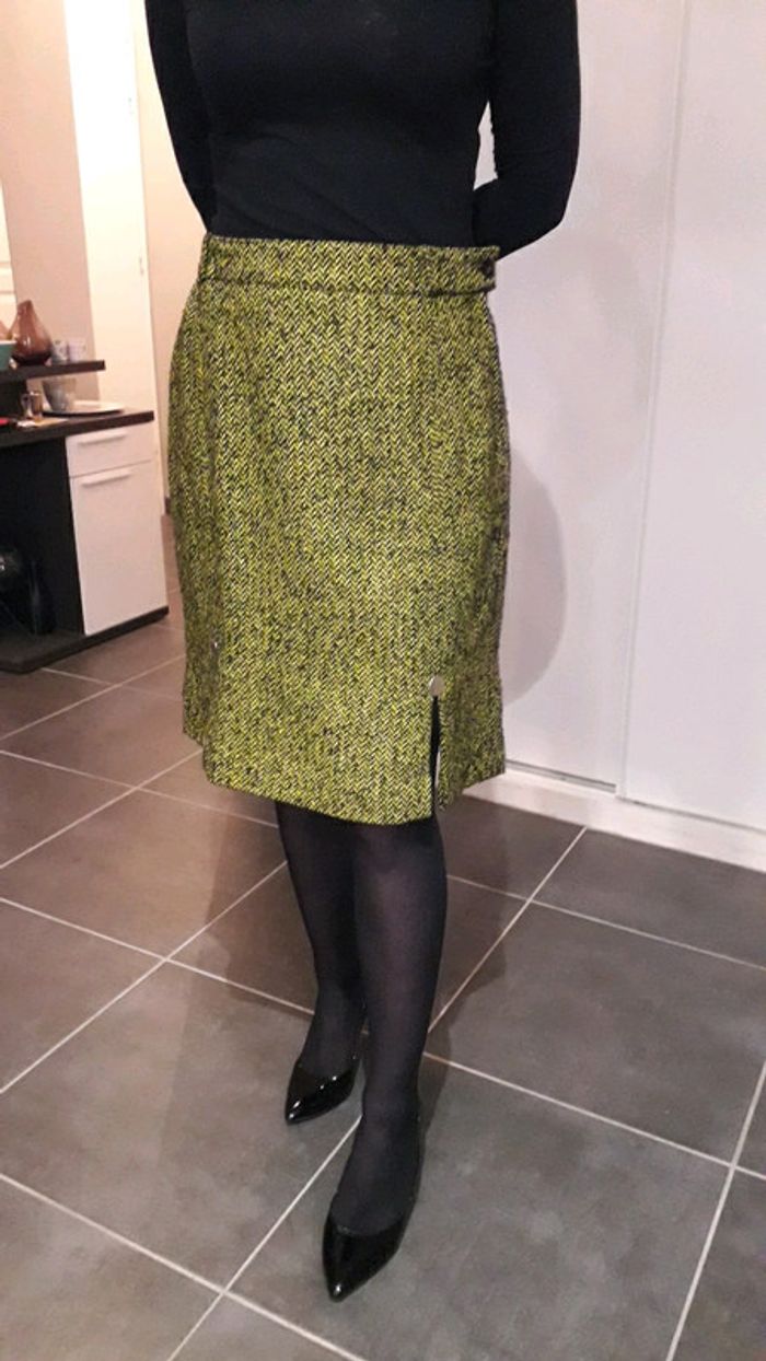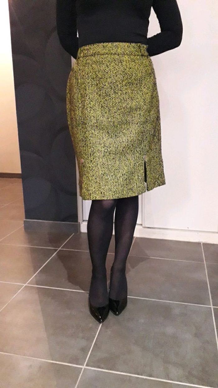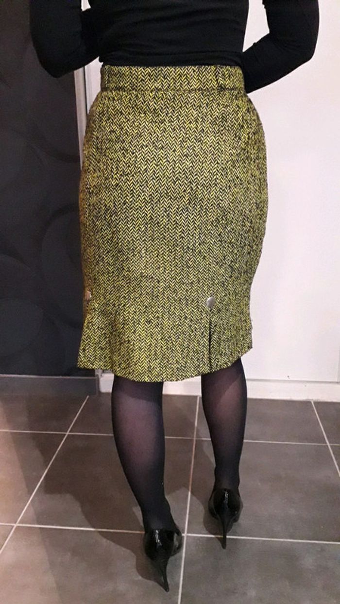 Contient de la laine Motif géométrique jaune et noir Taille haute Doublée Cintrée Fermeture sur le côté Originale avec ses ronds métalliques et ouvertures dans le bas. Taille indiquée 42 mais ira à un 40 Vintage, marque j.j.garella