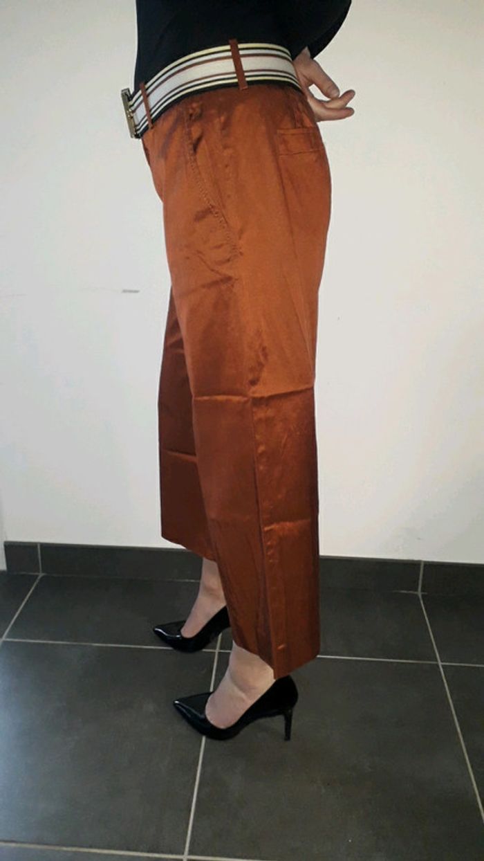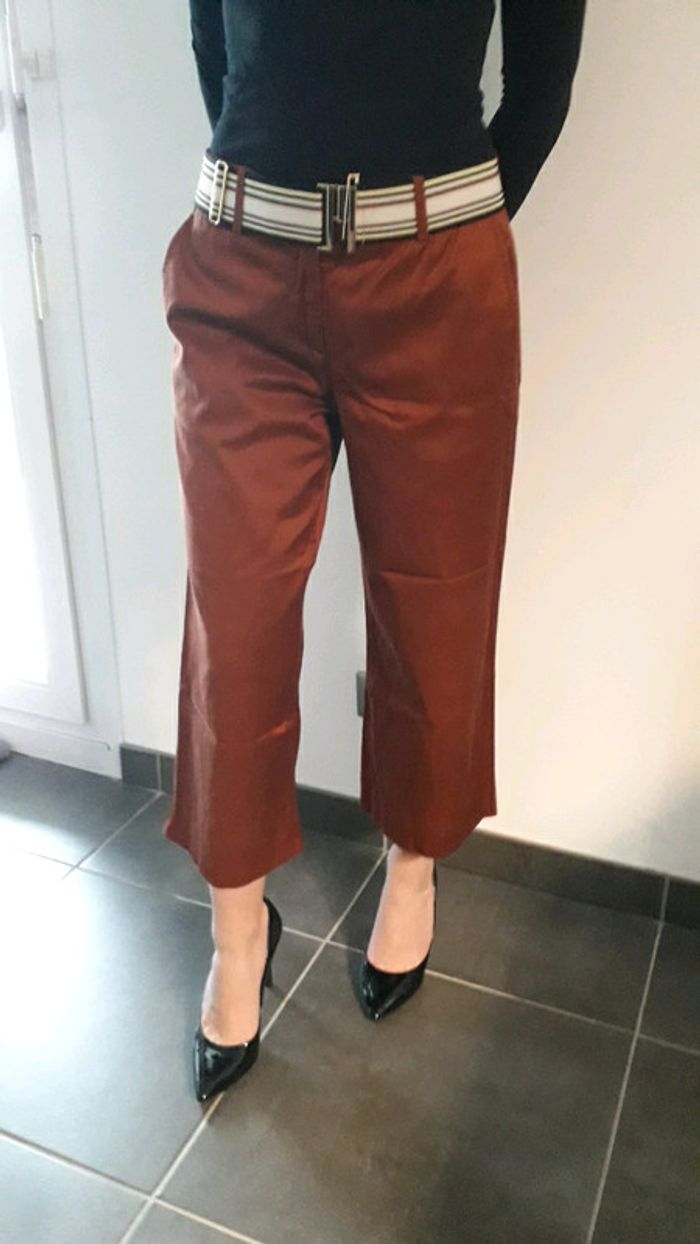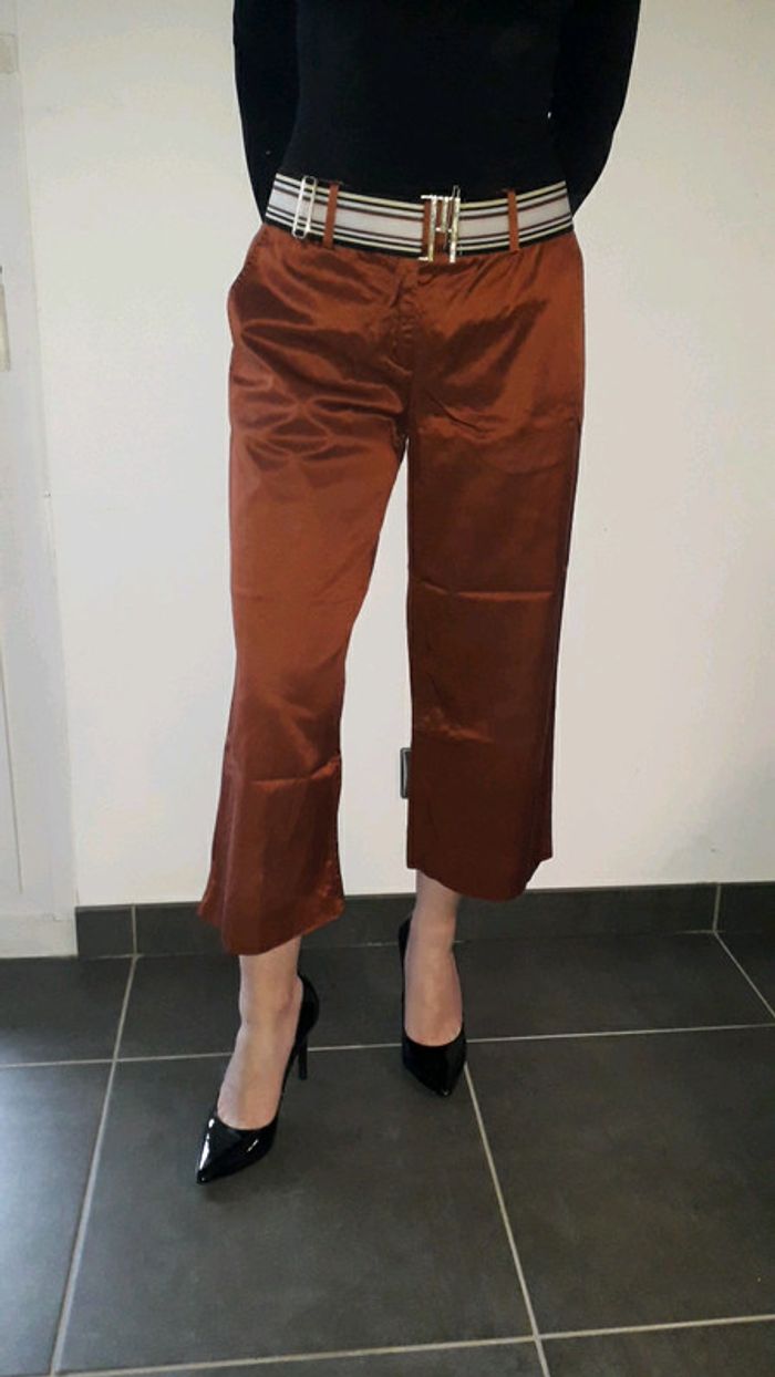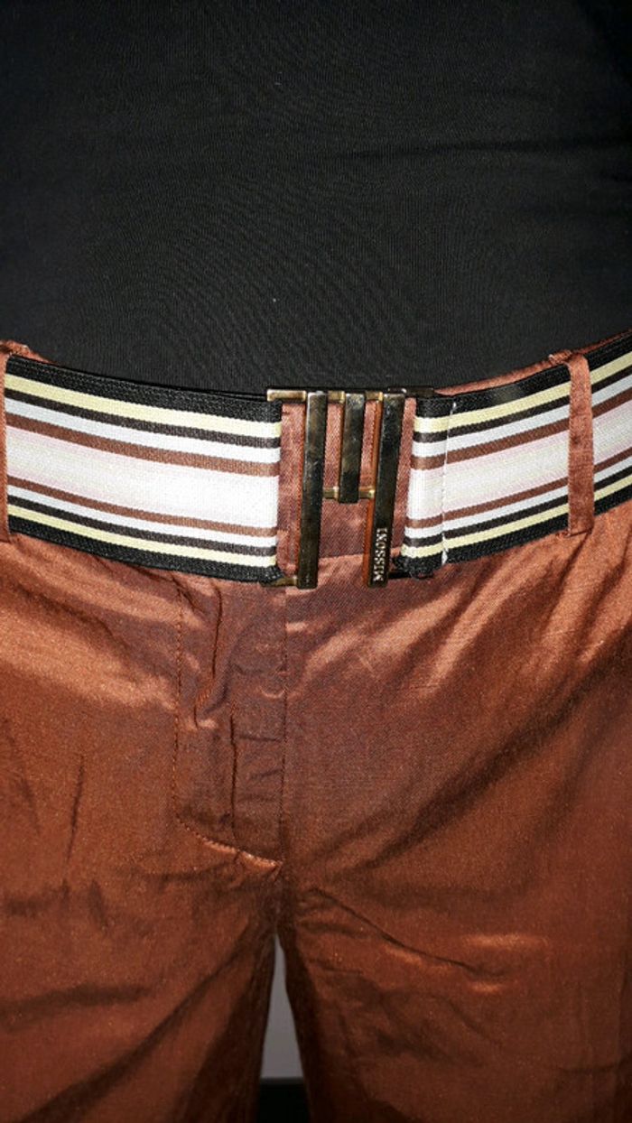 Joli pantalon Missoni matière satinée Couleur marron rouille Ceinture amovible Poche côté et arrière Contient de l'élastane Fabriqué en Italie Très bon état mais petit point sur l un des ourlets à refaire. Ou au fer a repasser ..que je n ai pas !