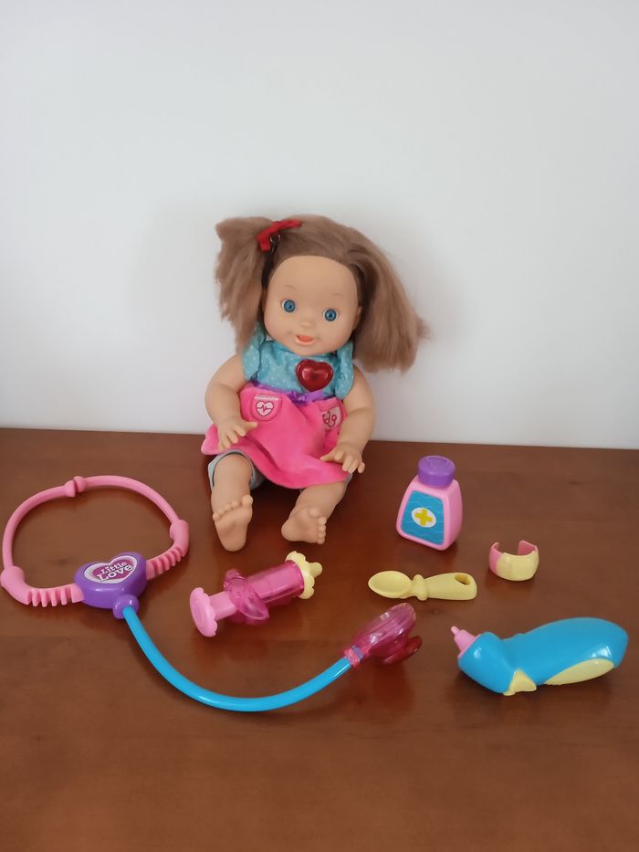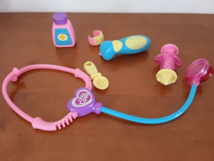 Comprenant 6 accessoires: un stéthoscope, un thermomètre, une seringue, une cuillère, une bouteille médicament et à pansement.