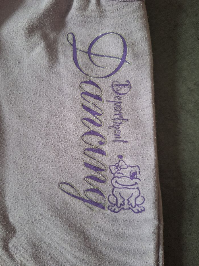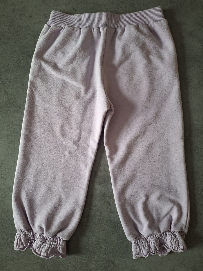 Pantalon de jogging parme avec dessin et inscriptions devant, 2 poches devant, bas des jambes resserrés, taille élastiquée manque cordon, taille 96cm 30 mois, porté mais en bon état