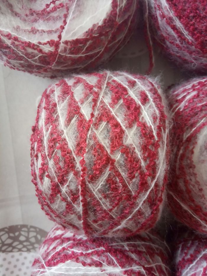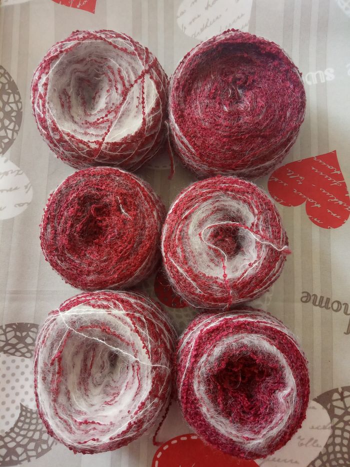 Lot de 6 Pelotes fantaisies (570g) Couleur: Bordeaux/Prune et Blanc effet bouclettes 1 fil très fin mohair et 1 autre fin bouclettes au total 570g Aiguilles N°2-2,5 Lot en parfait état