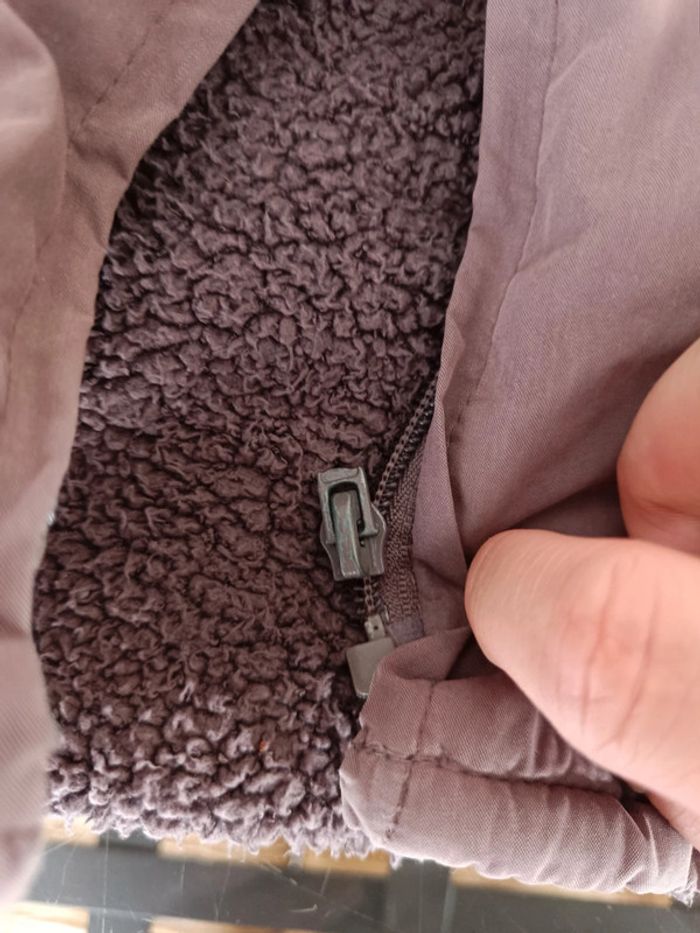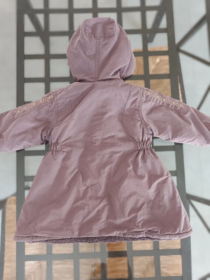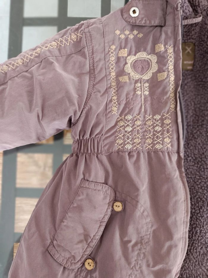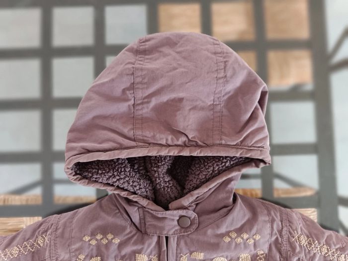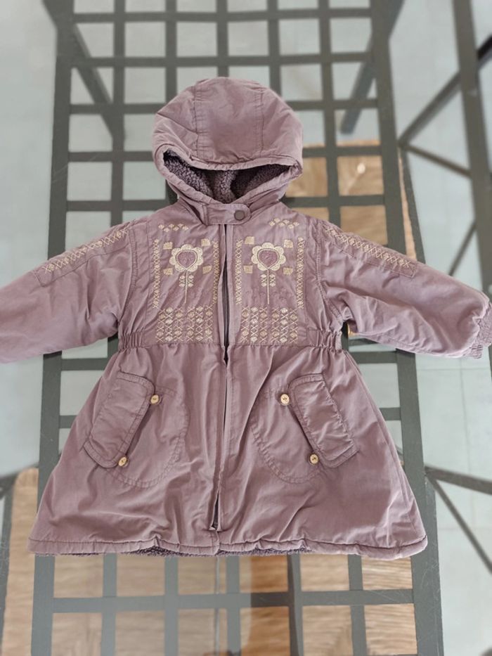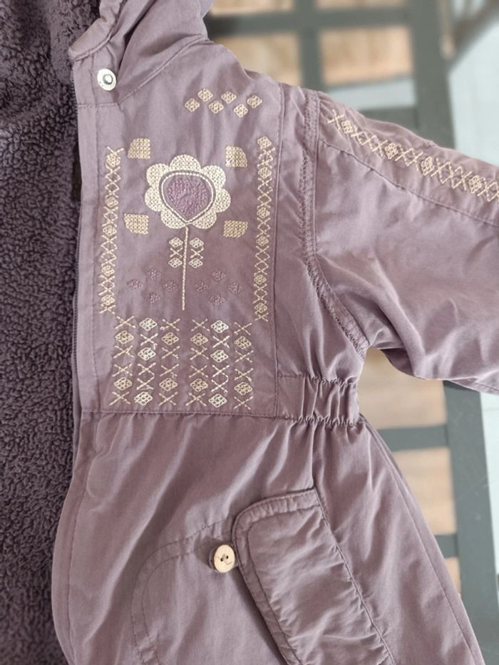 Dessin : motifs brodés, fleurs. Boucle cassée de la fermeture éclair (photo). Fermeture éclair ok. Manteau chaud. Article sans trou ni tâche. Taille : 18 mois. #melody45340bebe18mois