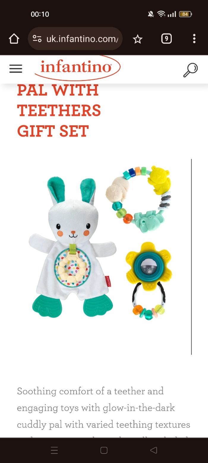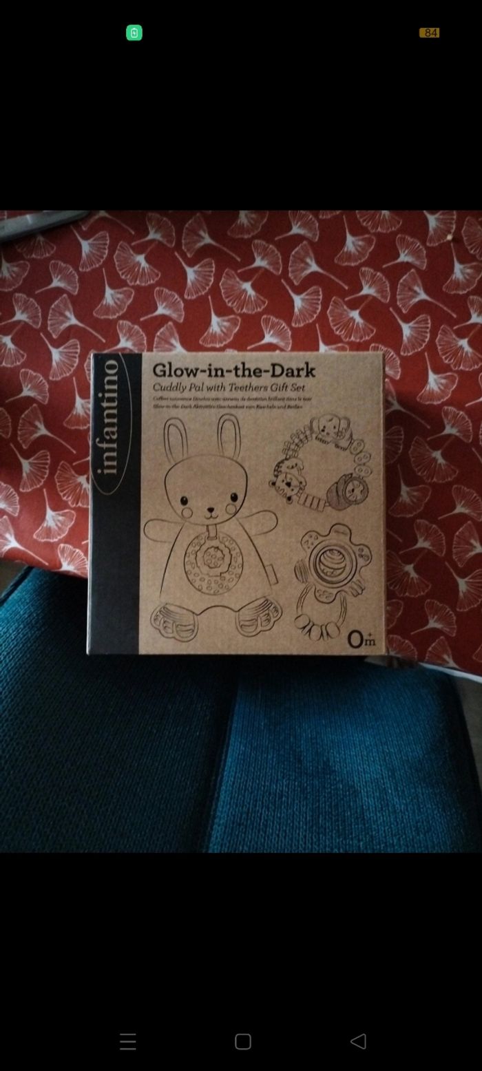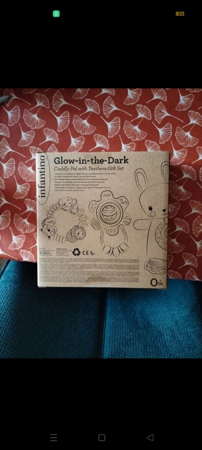 Coffret de naissance 3 pièces Doudou avec anneau de dentition brillant dans le noir Neuf non ouvert, prix d'achat 24 euros