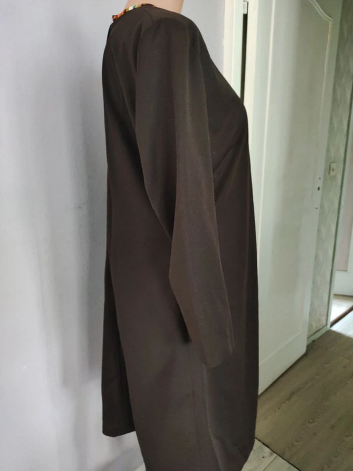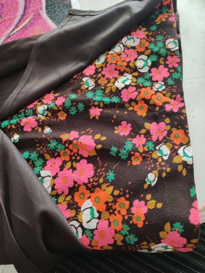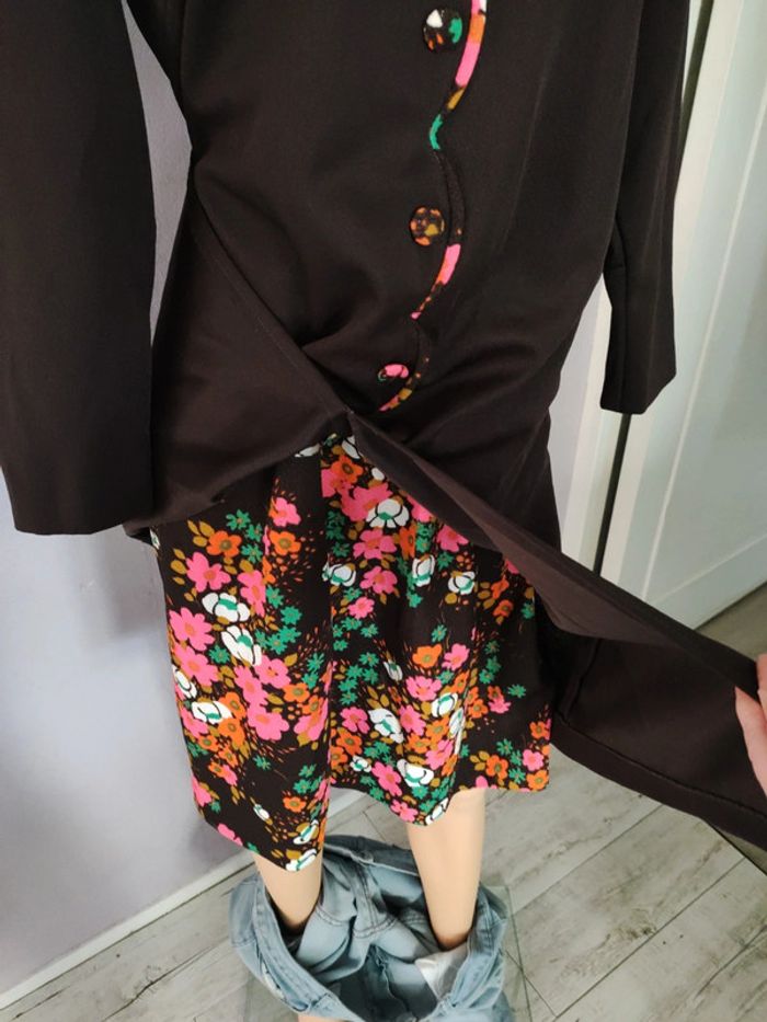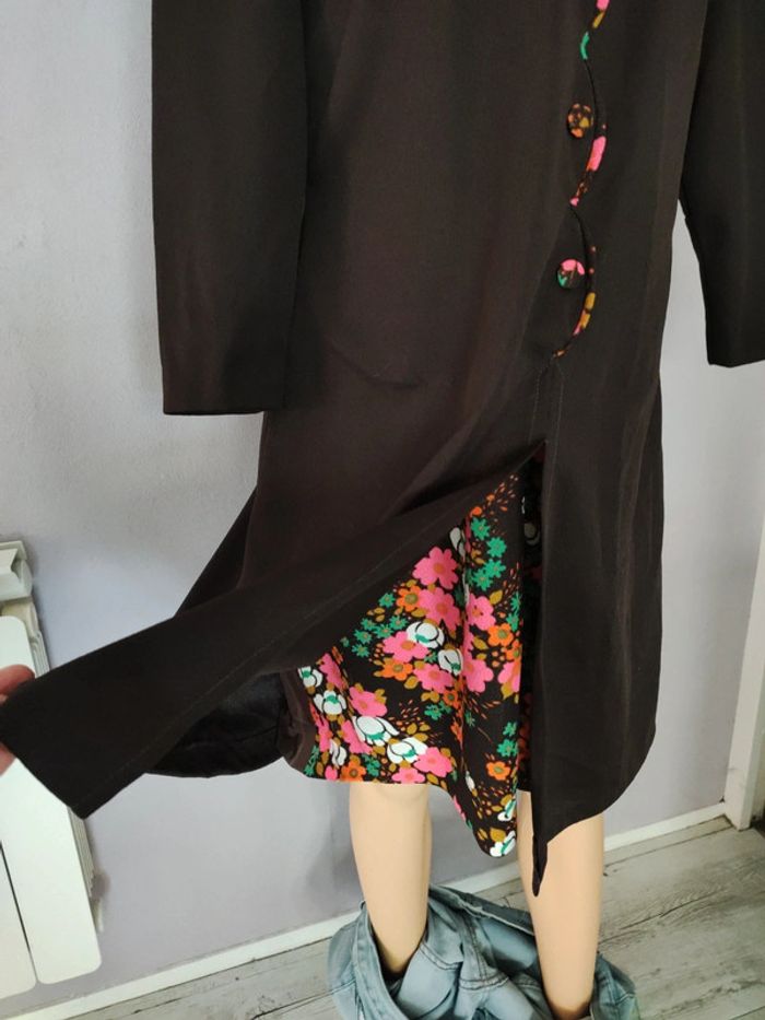 Très bon état Épaules 43 cm SL 50 cm Longueur 96 cm Robe marron somme toute assez classique mais la bonne surprise est que la doublure est fleurie avec une fente sur le devant les boutons et l'encolure sont assortis Matière d'inspiration 70's certainement du polyester Taille 40/42 #baronne42 #baronne2vintage #baronnepolyester