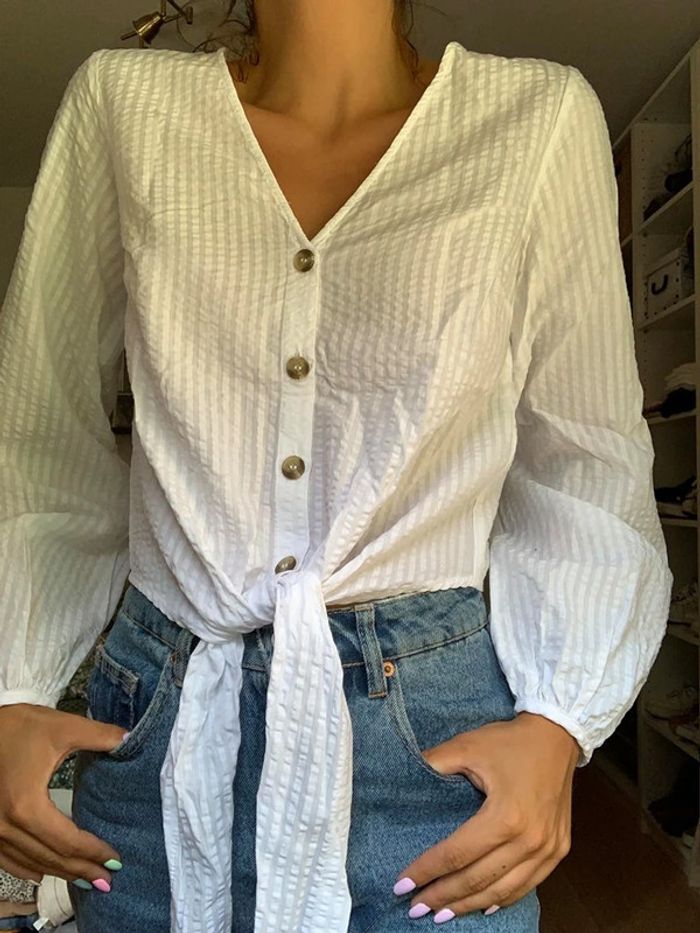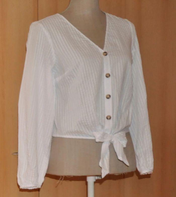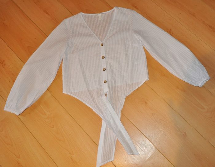 blouse en viscose avec décolleté en v, boutonnage et liens à nouer dans le bas, manches longues légèrement bouffantes et élastiquées aux poignets, très peu portée et en parfait état. Taille 34/Xs, largeur sous aisselles 45cm longueur 46cm #ophhaeXS