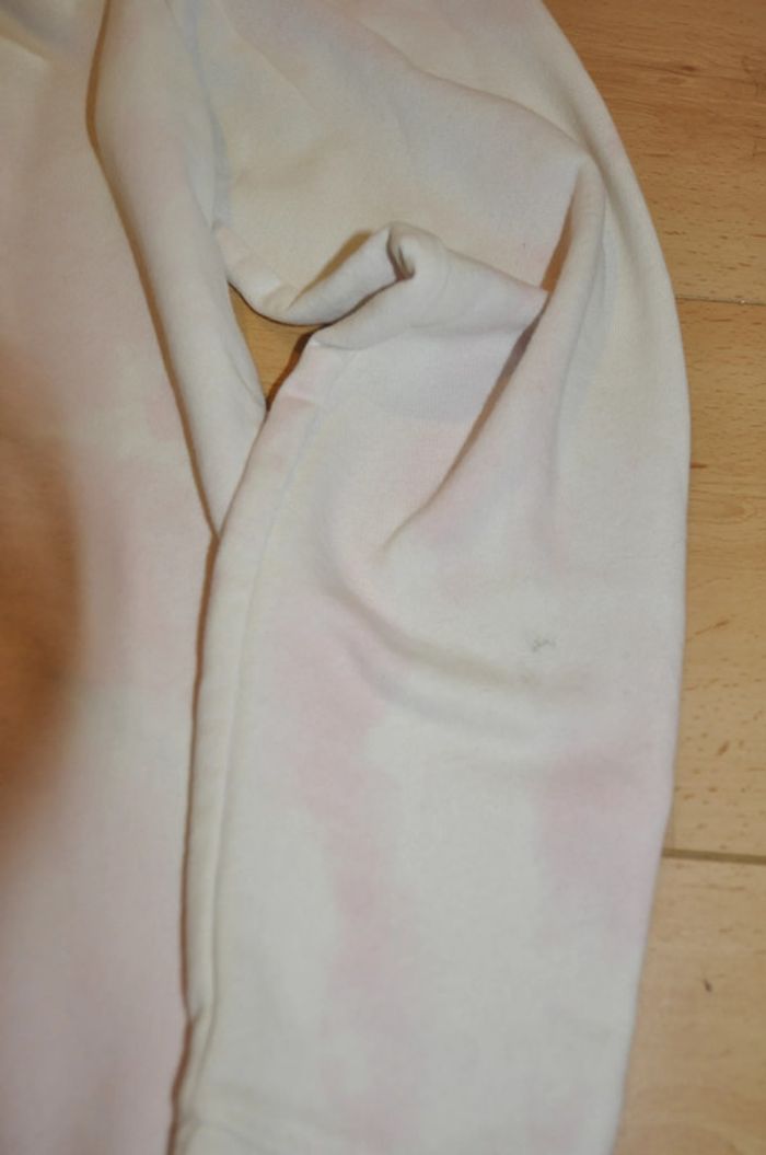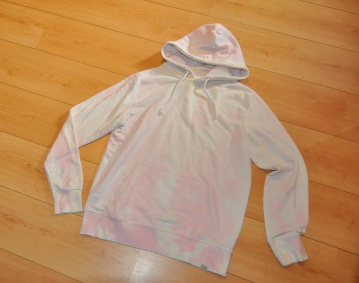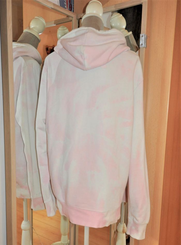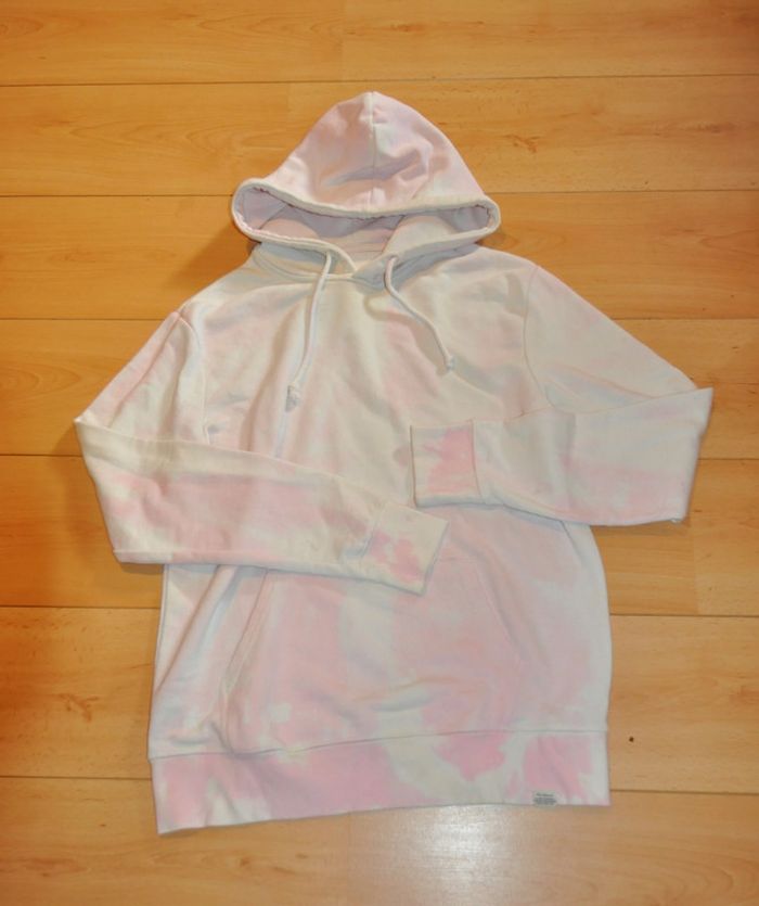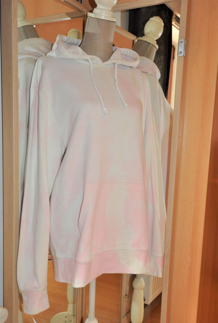 sweat shirt avec capuche tye & dye tons rose crème et beige, modèle oversize avec capuche et poche kangourou, malheureusement petit "défaut" (trace de quelques millimètres)au niveau de la manche gauche montré sur la 5ème photo