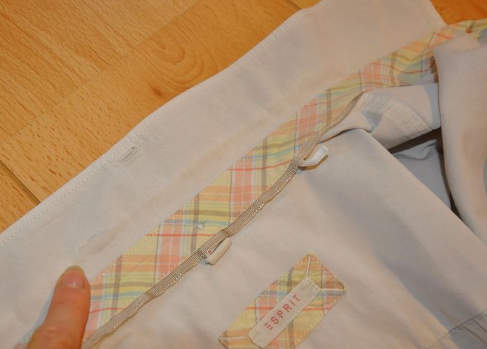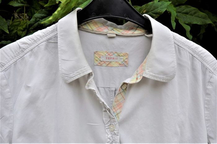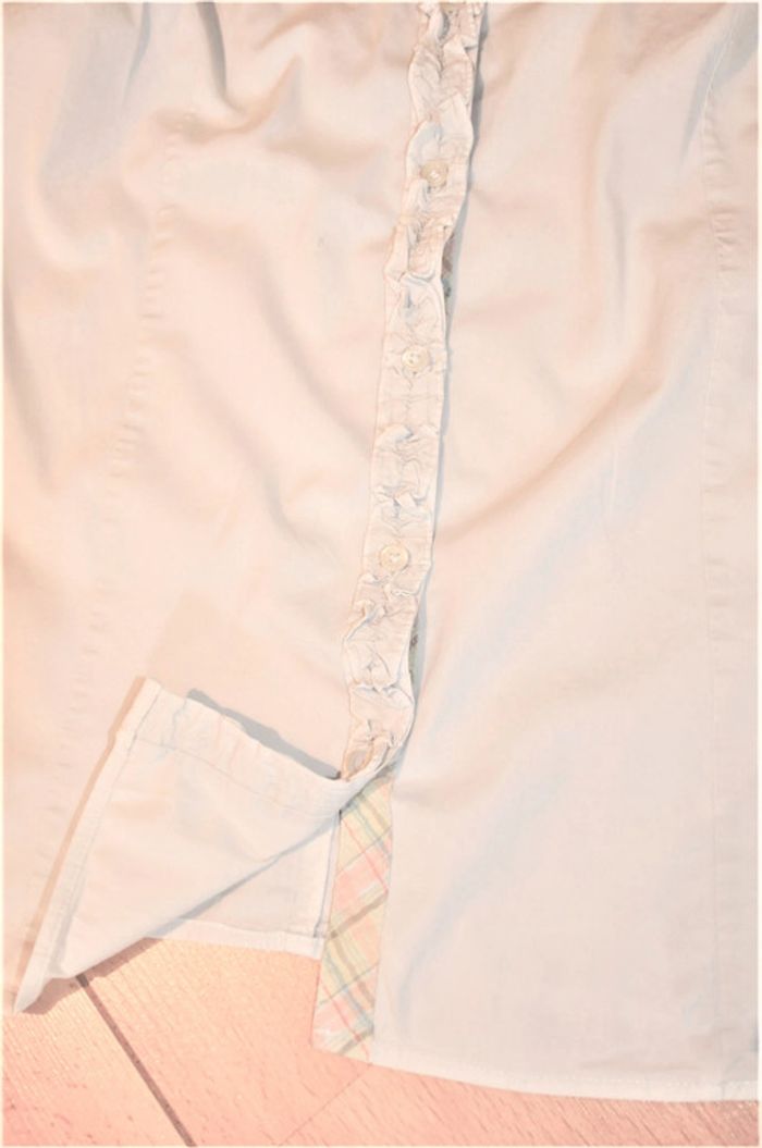 chemisier uni blanc glacier ( mouillé lors du lavage il parait gris clair) avec bande motifs pastels intérieur col et poignets et bande boutonnée , petite trace sur l'intérieur de l'arrière du col voir 6eme photo taille allemande 42-française 44, largeur sous aisselles 53cm #philhaefemmeXXL