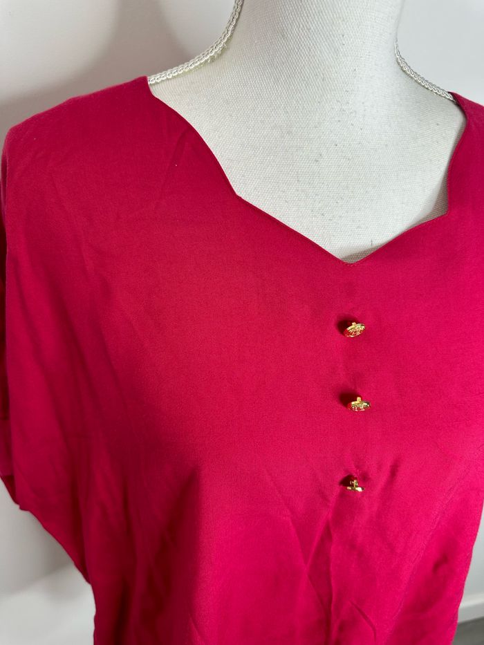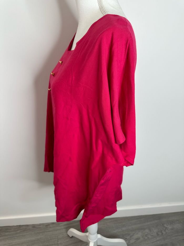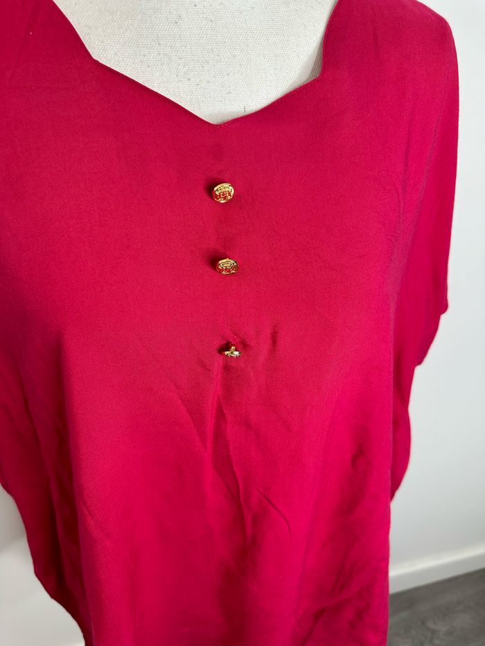 Blouse - Excellent état - Taille 50 équivalent 5XL - Rose fuchsia et dorée - Manches courtes - Boutons dorés - Vintage, années 80’ - 100% Viscose