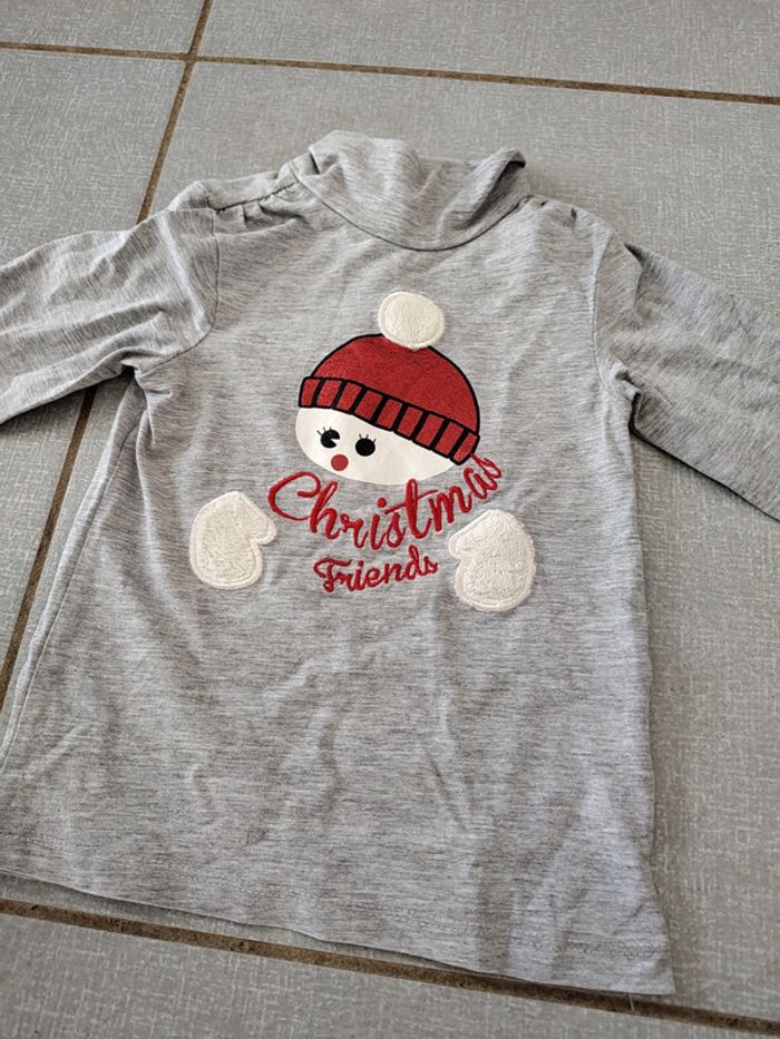Sous-pull gris avec col cheminée thème Noël Bonhomme de neige avec bonnet pailleté sur le devant. Mains du bonhomme de neige en sherpa. Ouverture pressionnée au dos Taille 23 mois (86 cm) 85% coton 10% viscose 5% élasthanne Foyer non fumeur