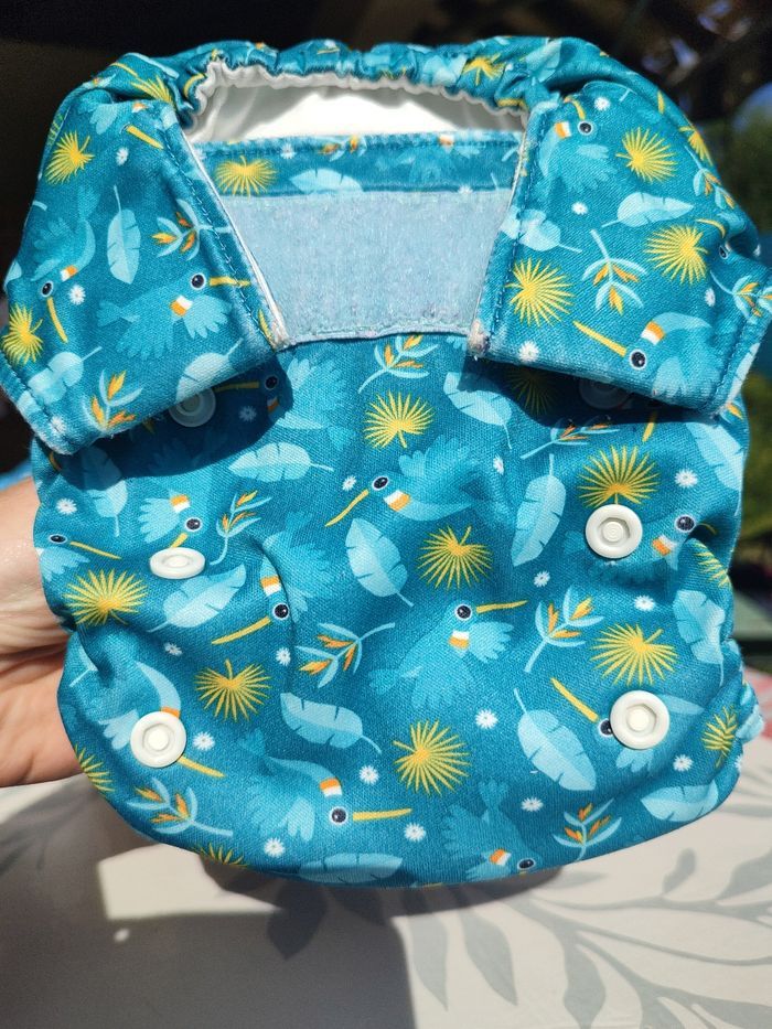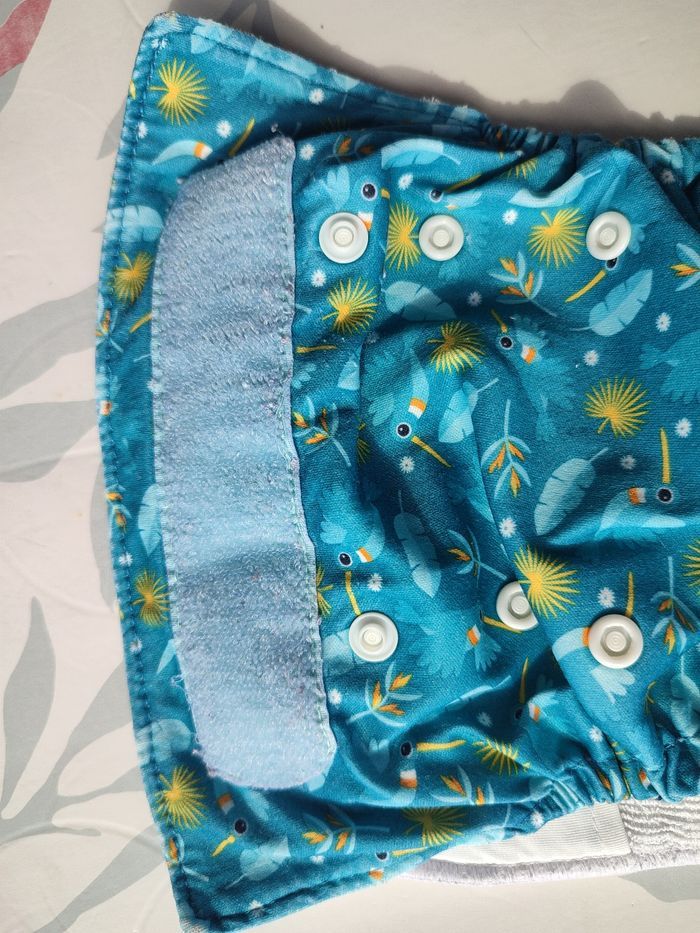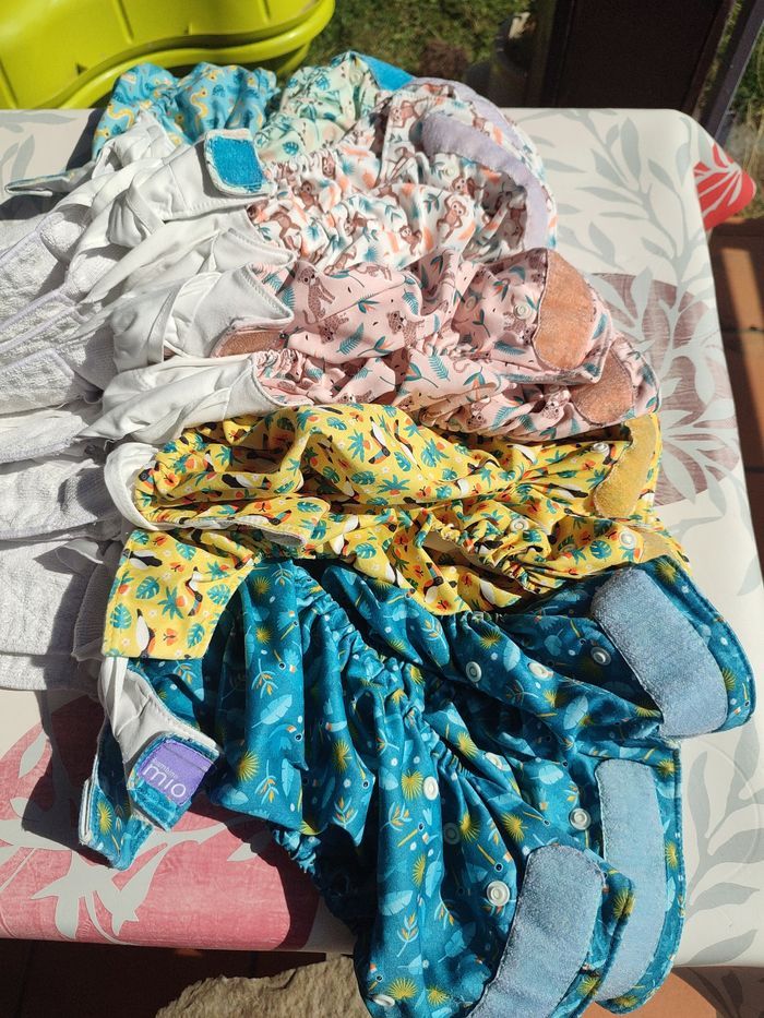 Couches lavables d'occasion Décrassage et désinfection pour la vente. Marque : Bambino Mio Modèle : Miosolo Taille : taille unique Type : TE1 à poche avec insert microfibre cousu Lot 5 couches Coloris bleu colibri, jaune toucan, turquoise serpent, léopard, vert paresseux et blanc singe. Utilisées 24 mois environ , Vente car bébé viens d'atteindre la continence :-) Entretien : routine validée par le groupe CLVA. - Nettoyage/désinfection mensuel du lave-linge (90°) - Cycle 1 : 30°, 1200 t/min, 1/3 lessive ariel original, 1/2 remplissage - Cycle 2 : 60°, 1200 t/min, lessive ariel original, 2/3 remplissage, rinçage + Utilisation Intensité normale (stock suffisant pour une rotation normale des couches et inserts) Élastiques : pas aussi serrés que neufs, ajustement normal. Tâches : aucunes, inserts et voile en contact avec les fesses blancs, couleurs intactes Velcros : frises un peu, pas de bouloches