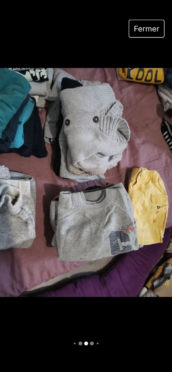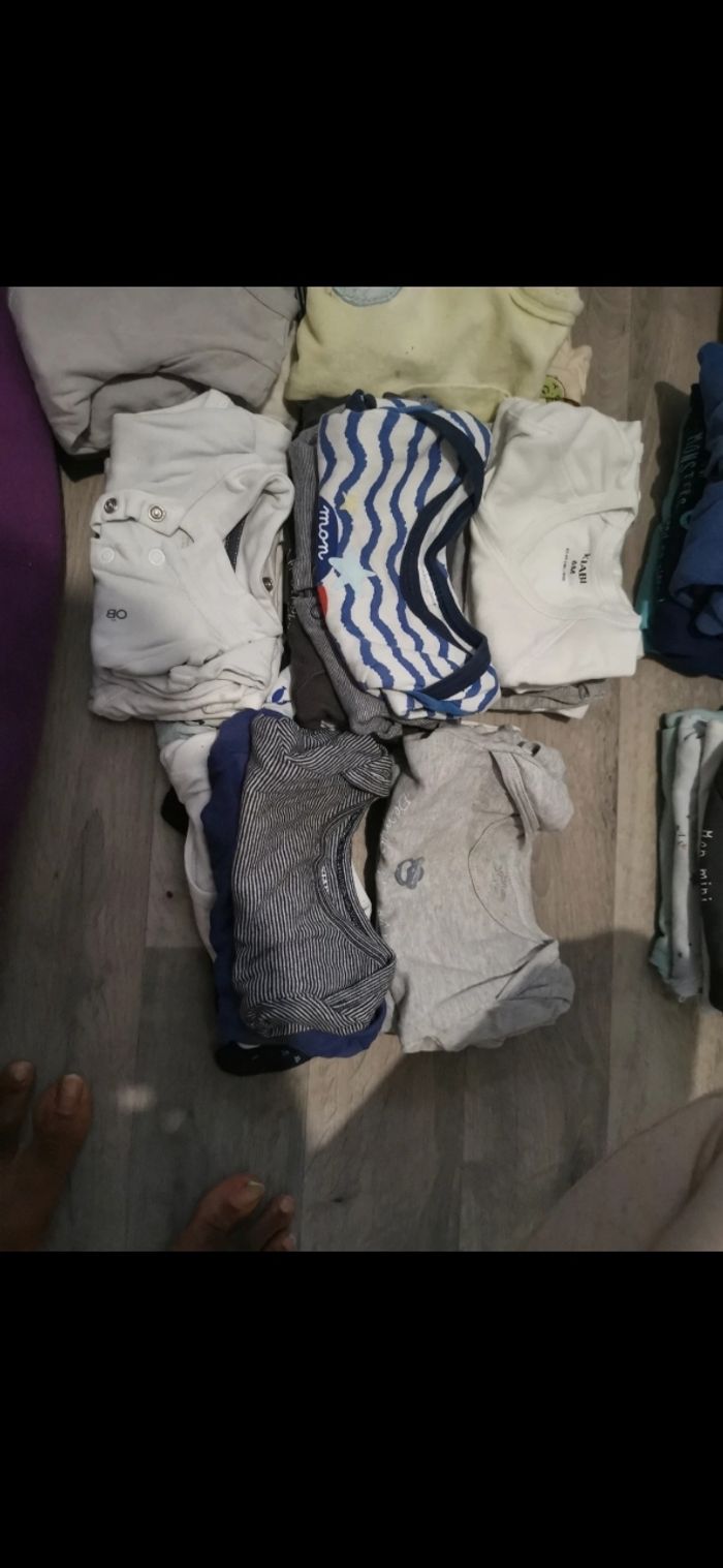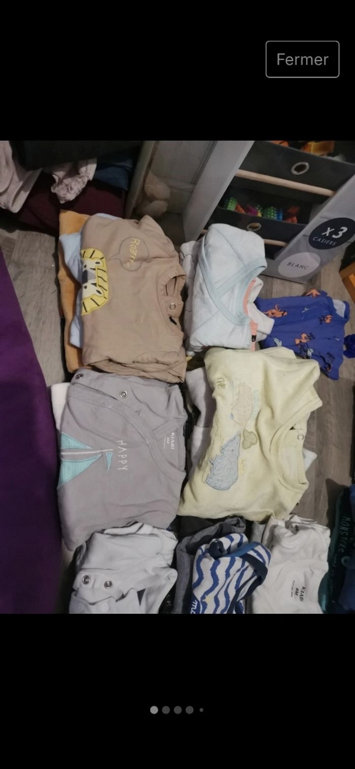 Lot de vêtements bébé de 3 à 6 mois 21 boddy manches courtes 4 pyjamas 6 mois 7 pyjamas 3 mois 2 pyjmas naissance et 2 boddies naissance 2 shorts 7 pantalons 2 joggings 9 pulls, sweats, et gilets 5 salopettes 7 tee-shirt manches longues 19 tee-shirt manches courtes 6 chemises manches courtes et manches longues 1 parka 2 vestes 1 doudoune Les boddy sont tachés mais le restes des vêtements est nickel surtout les chemises