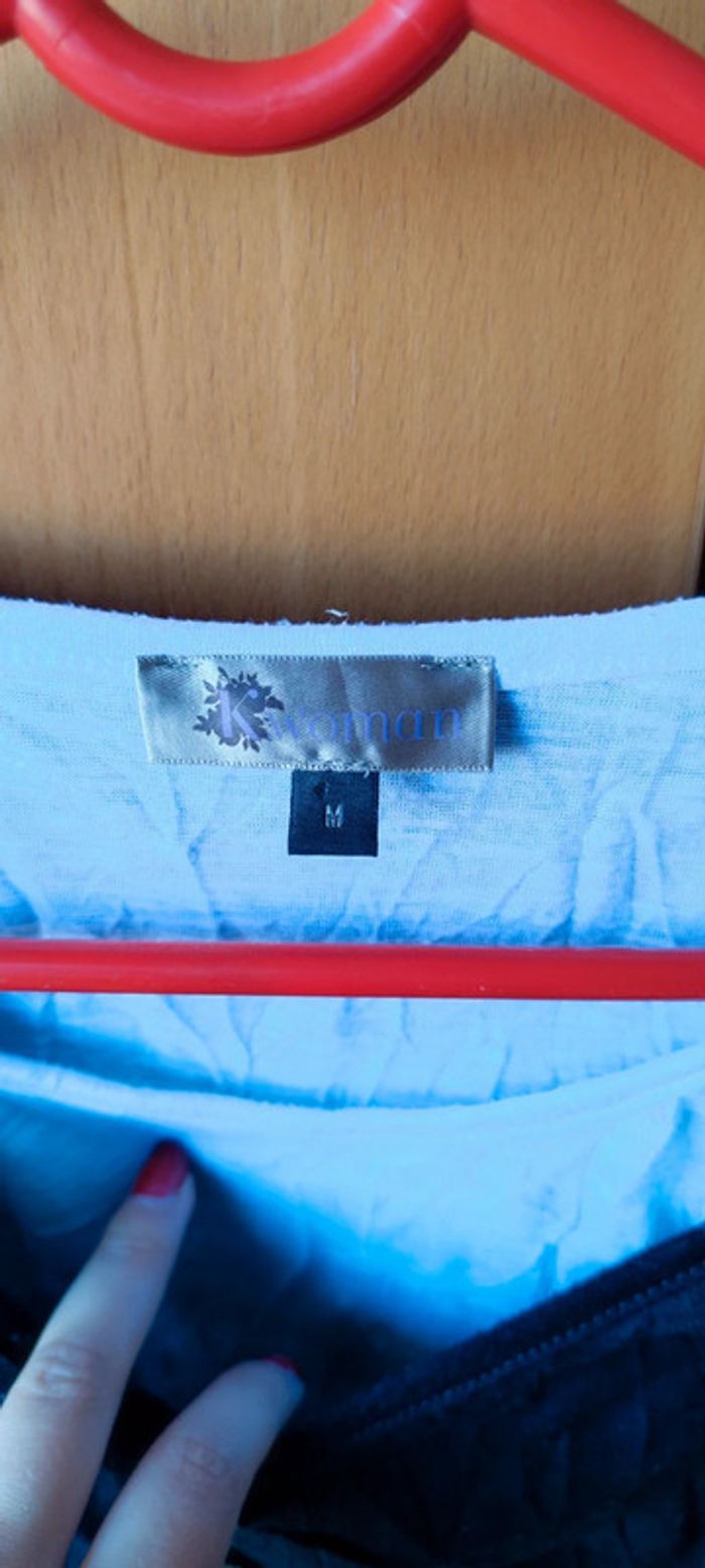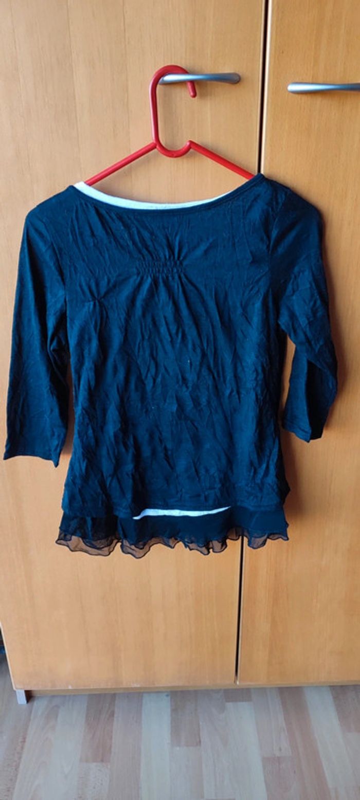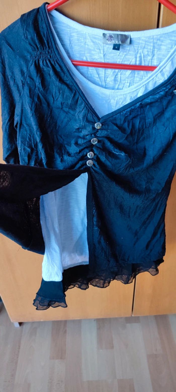 Haut habiller noir et blanc Tee shirt blanc avec " veste " noir intégrées et dentelle en bas du tee shirt Taille M Manche 3/4