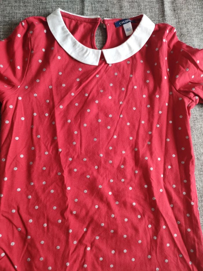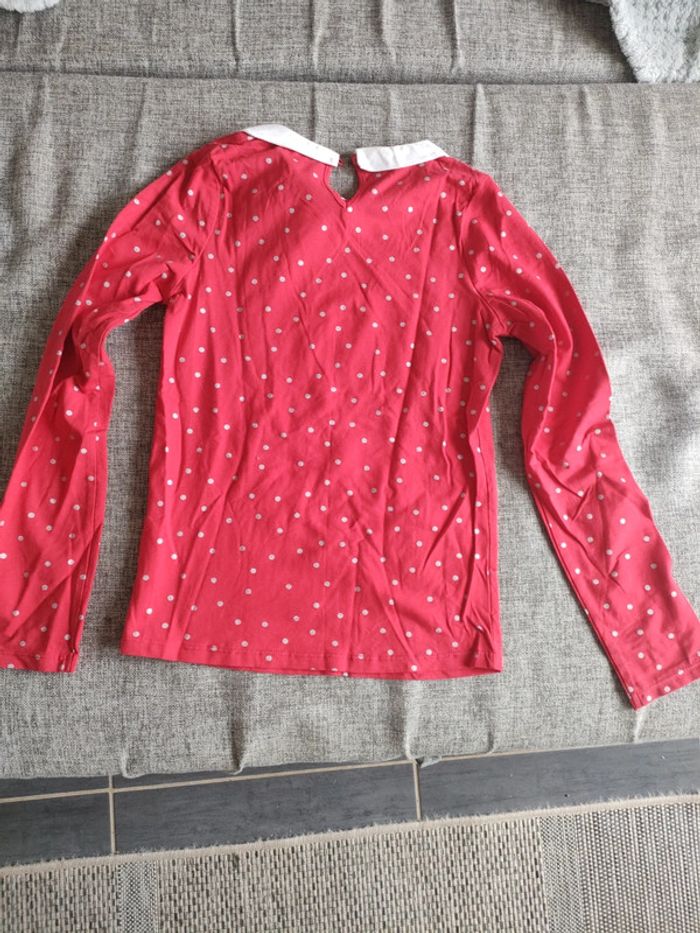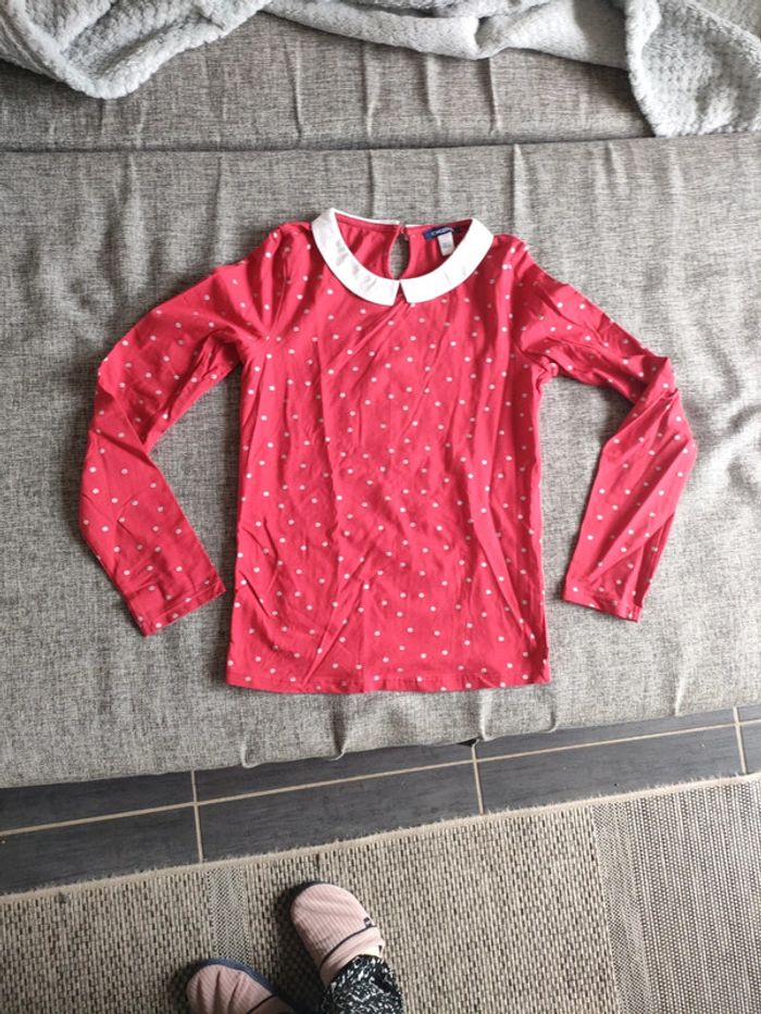 T-shirt manches longues rouge à pois gris. Col blanc. Okaïdi. Taille 12 ans .