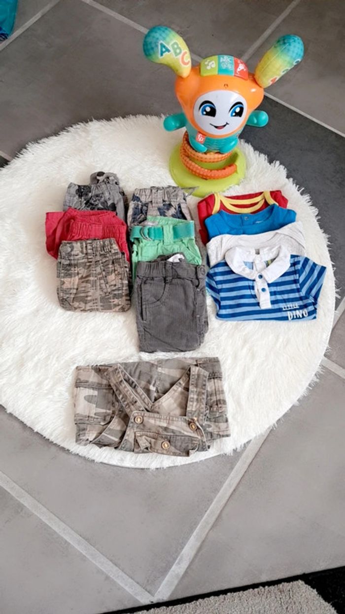 Très bon état 3 short 3 pantalons 4 boby 1 salopette 3 tee-shirt manche courtes 1 chemise à caluche 2 combi short 1 ensemble 1 pull sans manche 2 tee-shirt manche longues #9moisgarçon_celinecasassus
