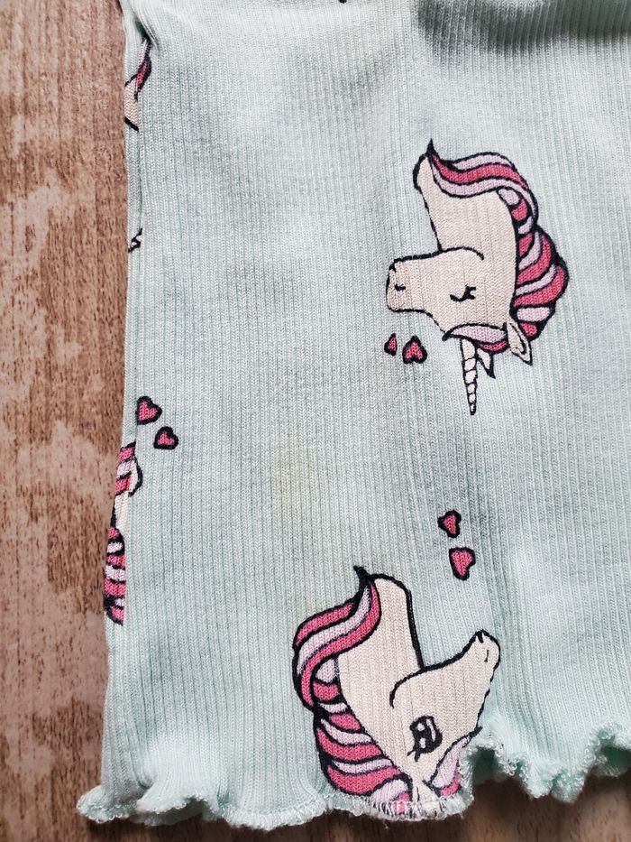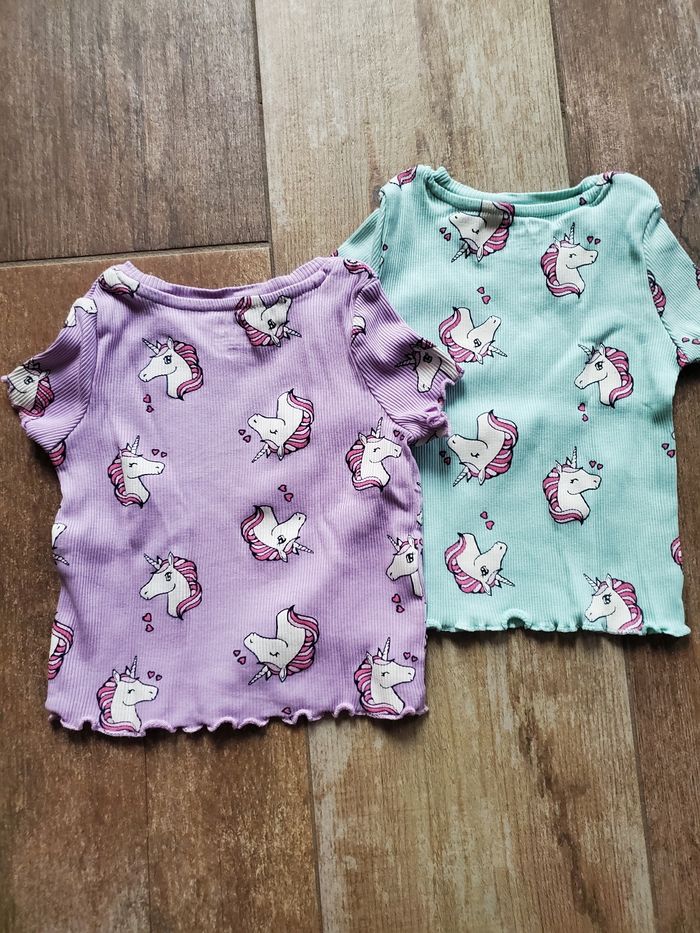 2 t shirt licorne 90/92cm Taille petit 1 tâche sur le t-shirt bleu,devant en bas à gauche Le lot 6€