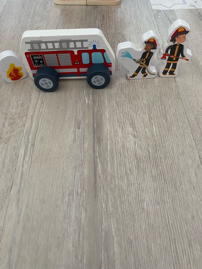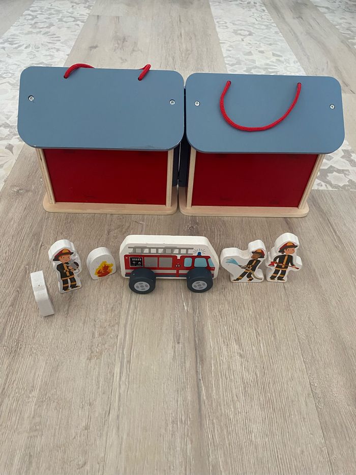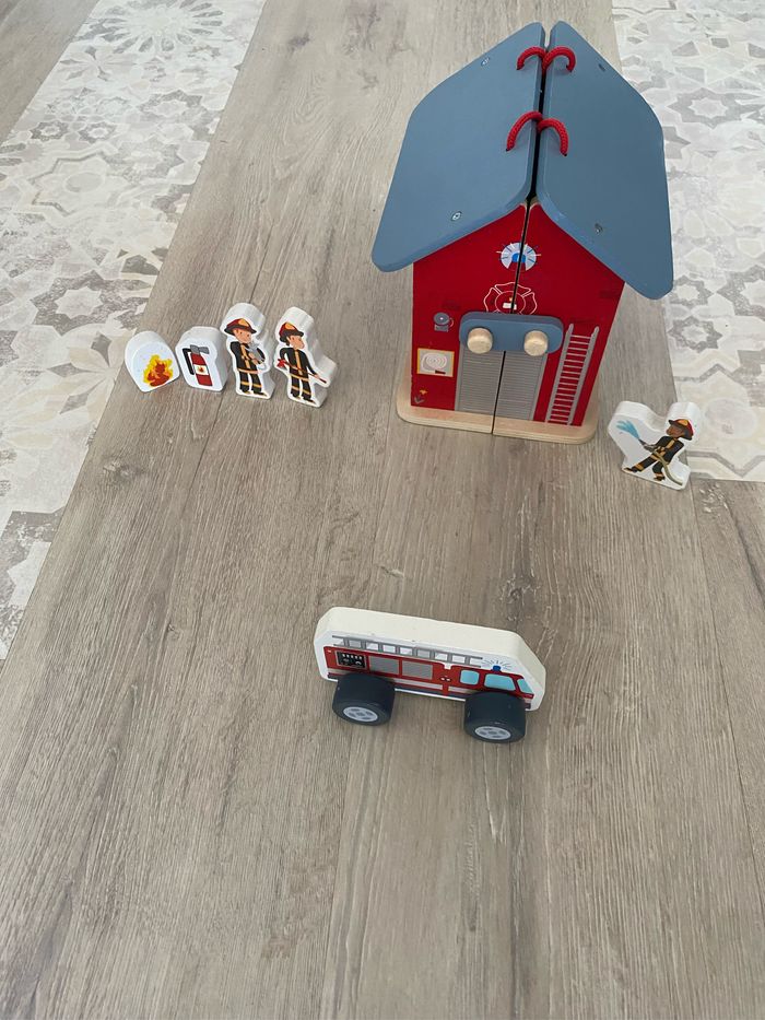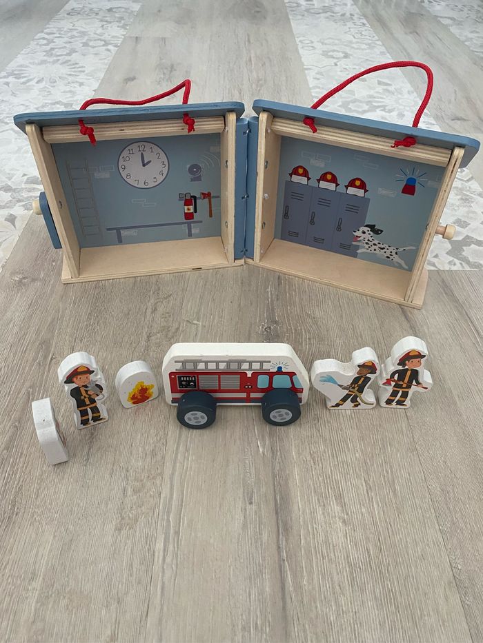 Petite caserne de pompiers avec figurines. La caserne se ferme pour la transporter.