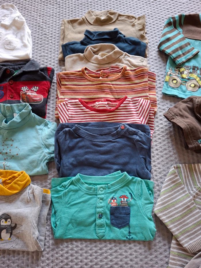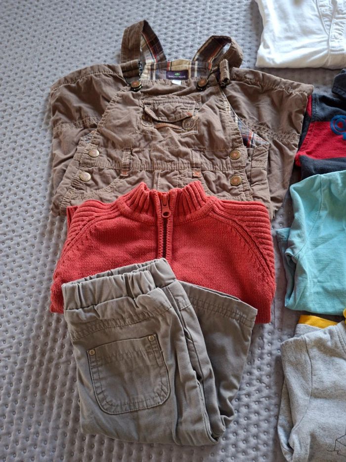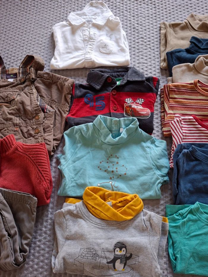Lot composé de 18 pièces 1 salopette sergent major 1 gilet rouge à zip 1 pantalon influx 1 body blanc manches longues avec col kitchoun 1 polo Cars 5 sous pulls mes petits cailloux tex 4 T-shirt in extenso et autres 2 ensembles dont 1 Obaibi #6mois_emiliestouvenel