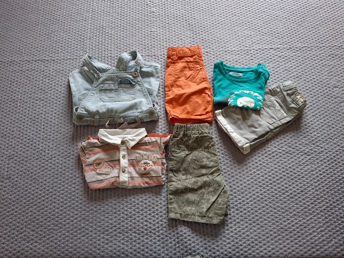 Lot de 6 articles 1 salopette okaidi 1 ensemble Obaibi short gris et t-shirt vert 1 toute petite tache comme montré sur la dernière photo. 1 polo sergent major 1 short orange Obaibi 1 short jungle kaki clair. #18mois_emiliestouvenel