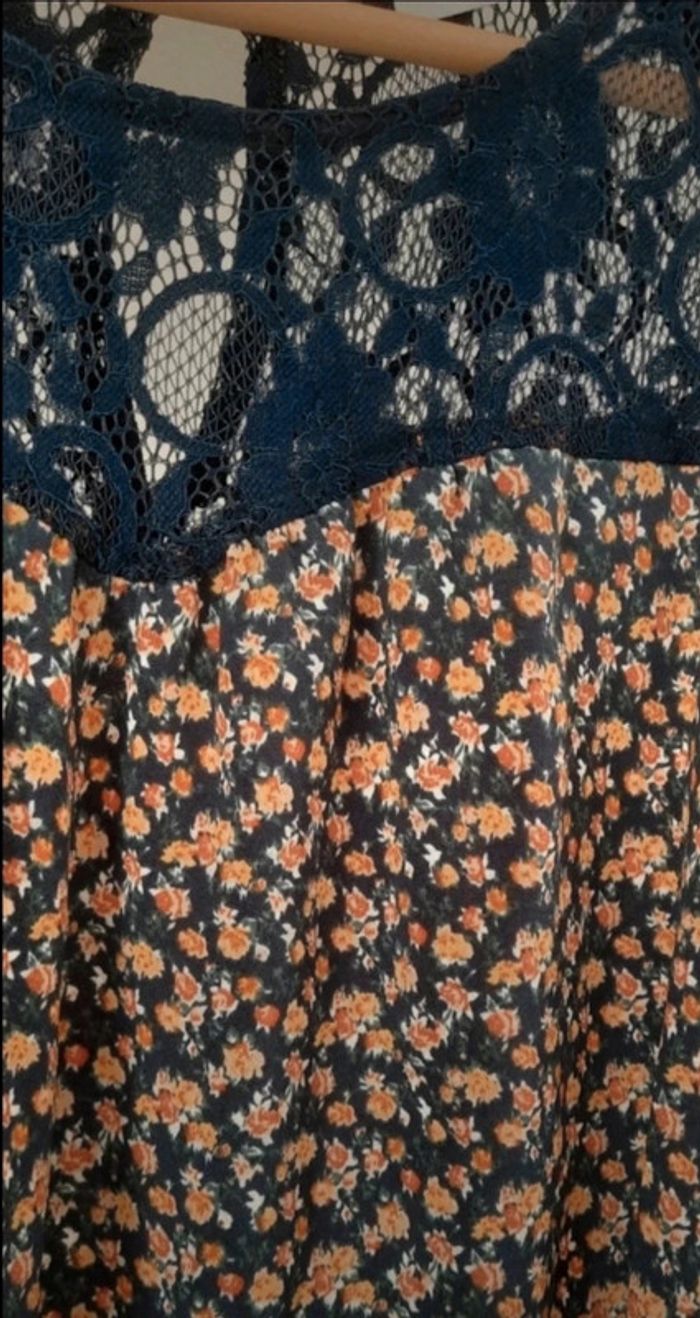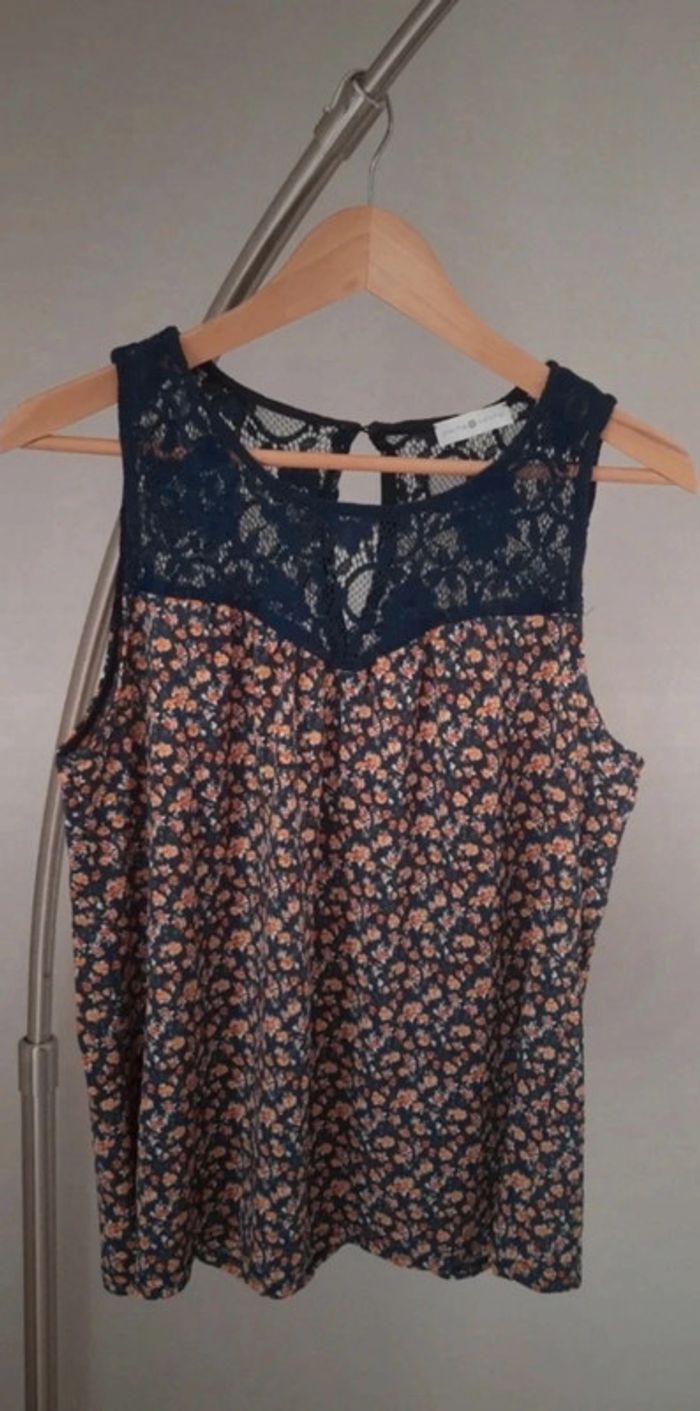 Dentelle couleur marine sur le dessus avec fermeture dans le cou grâce à un bouton. Sans manches Haut évasé et agréable à porter. Motif avec des fleurs 🌸 #haut_femme_emiliestouvenel