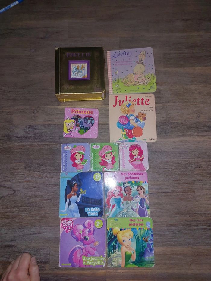 #jessicadebreulivreenfant Livres cartonnés my little pony Fée clochette 3 princesses dont 2 disney ( tiana ariel raiponce) un avec des feuilles transparentes manque 2 mais il me semble que c'était comme ça à l'achat Juliette part en vacances Poucette Lisette Seul le livre lisette est en tres bon etat Les livres charlotte aux fraises sont tres abîmé Les autres ont des defauts mais ils restent en bon état
