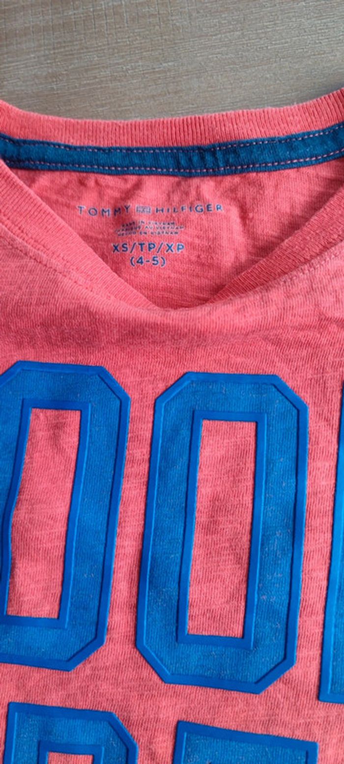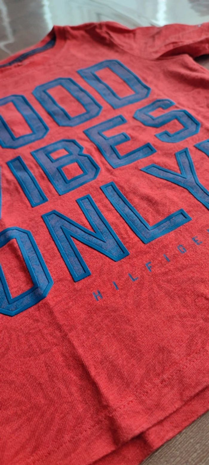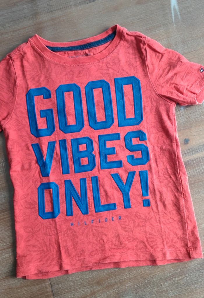Tee-shirt manches courtes Rouge clair avec motifs feuilles ton sur ton Inscription bleue Good Vibes Only devant Logo sur manche Marque Tommy Hilfiger Taille 4/5 ans, XS (vaut pour 104cms) Très bon état Envoi rapide #cyboulette44garcon4ans