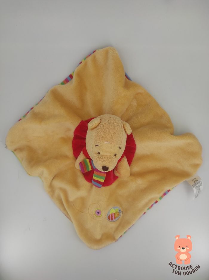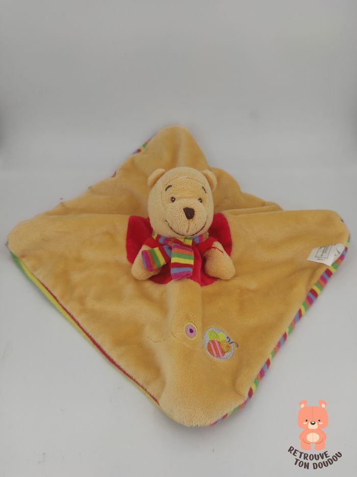 🍯 Doudou Plat carré Winnie l'ourson Jaune et rouge avec papillon brodé, verso rayé, écharpe, nicotoy 📏 Dimension : 20 x 20 cm environ ✨ État : Occasion, très bon état 🧼 Lavé avec lessive hypoallergénique 👀 Vous achetez le doudou que vous voyez sur les photos.