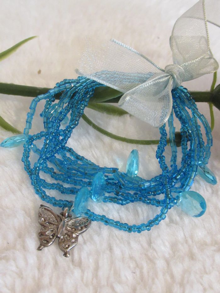 Bonjour, #bijouxetcheveuxnatsumi1004 Je vends ce joli bracelet composé de 7 bracelets à perles bleu ; regroupé par 1 ruban bleu ciel. * bracelets élastiques (perles et breloque papillon) * Diamètre : environ 8 cm N'hésitez pas à me contacter pour toutes informations complémentaires.