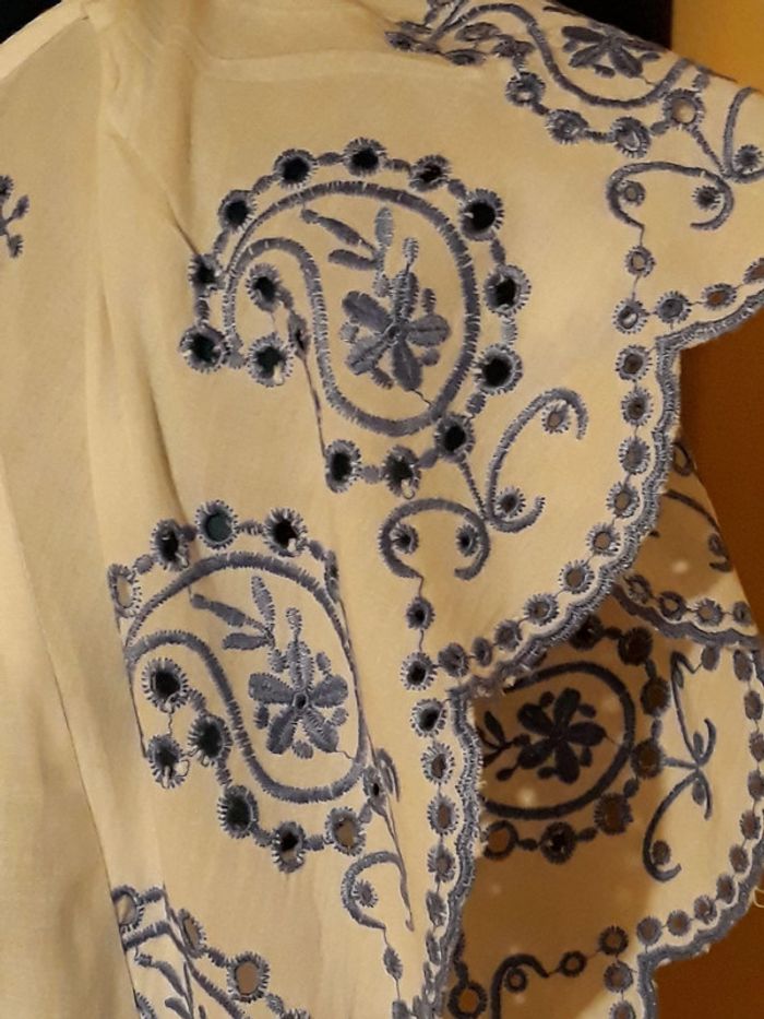 Bonjour, #38natsumi1004 #hautsnatsumi1004 #NEUFnatsumi1004 Je vends cette très jolie tunique, blanche et bleue, qui est en très bon état général - JAMAIS PORTE - seulement lavé pour la mise en vente. 💐 Matière légère pour les beau jours 💐 Col rond - Manches effet papillon 💐 100 % Coton 💐 Motifs : dentelles en bleu et forme arrondi aux manches et en bas MESURES A PLAT * Hauteur : 55 cm * Aisselle à aisselle : 44 cm N'hésitez pas à me contacter pour tous renseignements complémentaires.