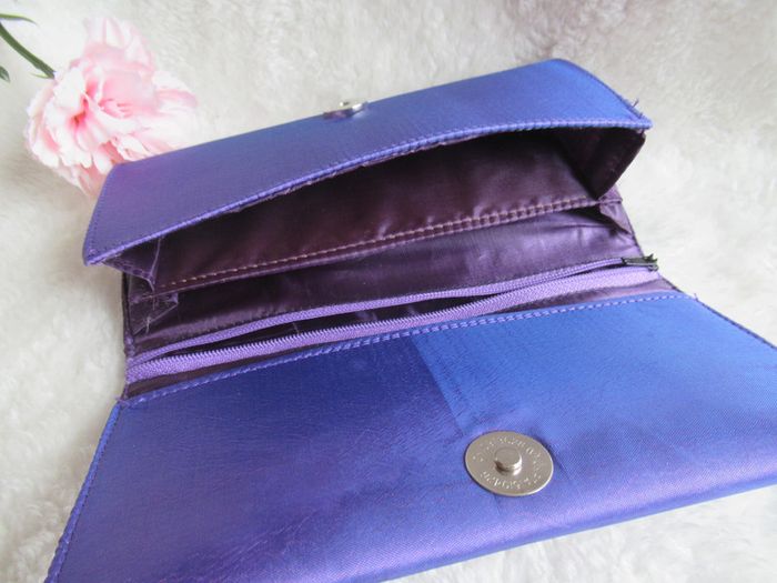 Bonjour, #sacsnatsumi1004 Je vends ce très joli portefeuille en tissu brillant, de couleur violet + broderie de fleurs. Il est en très bon état général... Il n'a jamais été utilisé. ATTENTION, reçu avec un défaut ! Il y une trace, comme si il avait pris l'eau (voir photo). * 2 pochettes * 1 pochette avec fermeture éclaire * Fermeture par bouton pression * Largeur : 19 cm * Hauteur : 10 cm N'hésitez pas à me contacter pour toutes informations complémentaires.