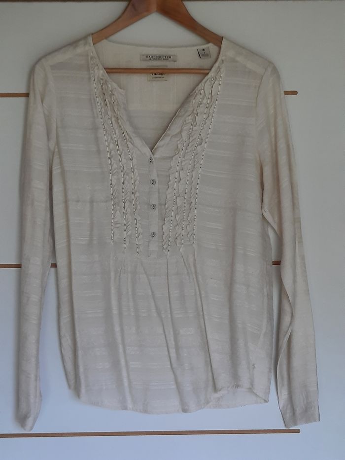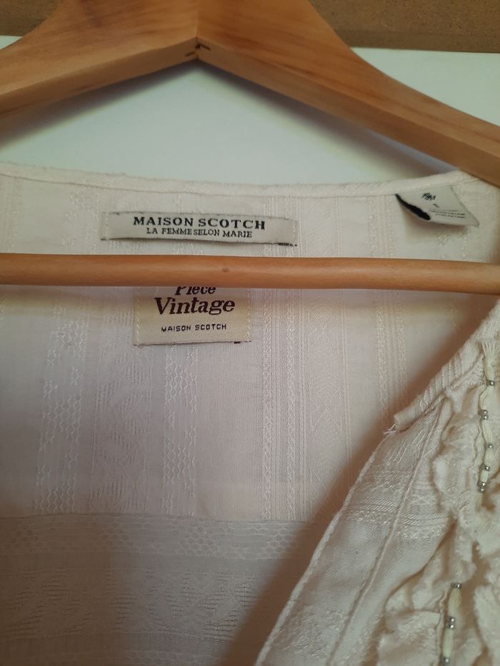 Blouse vintage Maison Scotch coloris écru. Taille 1 correspondant à une taille 38. Matière 80% rayon, 20% polyester. Longueur : 65 cm Largeur : 48 cm Longueur de manche : 65 cm