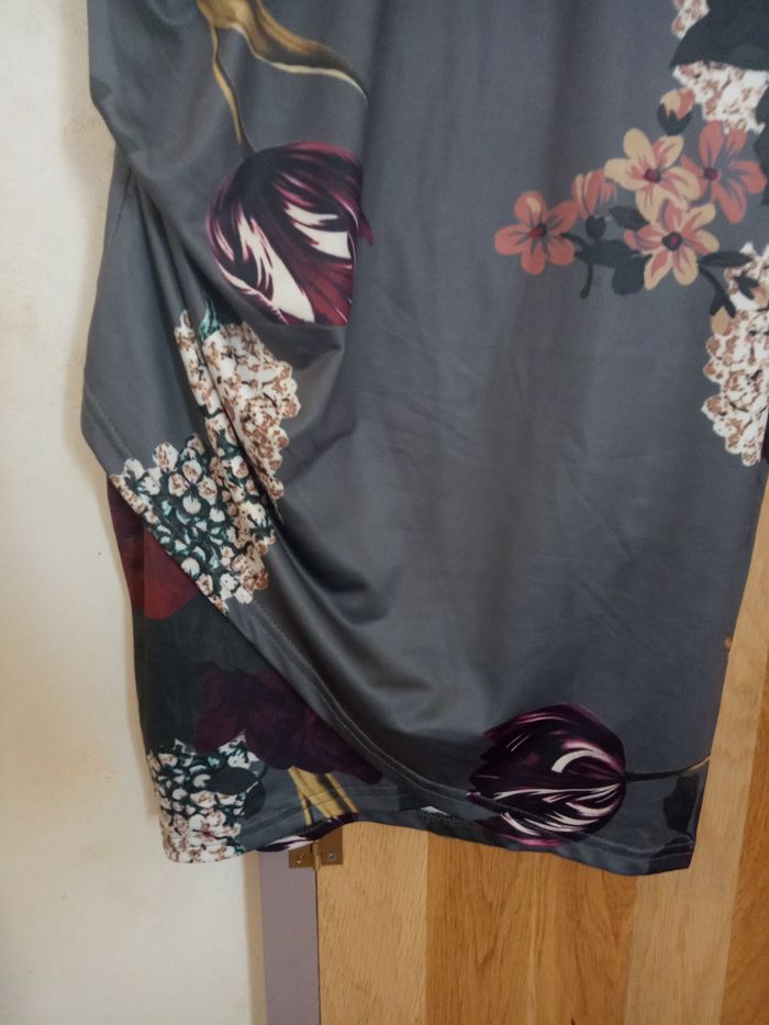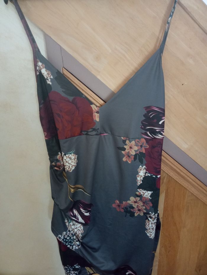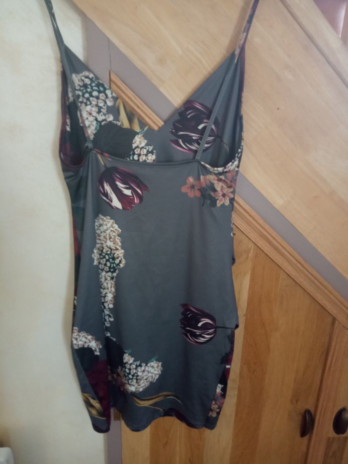 Ravissante Robe d'été Taille L Couleur: Fond Gris avec motifs fleuris colorés à très fines bretelles non réglables Forme élégante S'enfile, se porte près du corps et courte Dimensions: Longueur 57cm - aisselles à aisselles environ 39,5cm Matière: 65% Polyester + 35% Coton Robe comme Neuve, portée 1 fois, vendue comme sur les photos