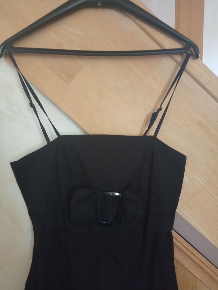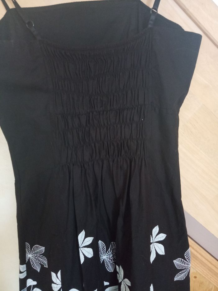 Ravissante Robe d'été Taille L Couleur: Fond Noir avec Motifs Blancs à très fines bretelles réglables Forme élégante Nœud décoratif sur le devant, gros élastique dans le dos S'enfile, se porte près du corps dans le haut puis évasée dans le bas Dimensions: Longueur 71cm - aisselles à aisselles environ 38cm Robe en parfait état, vendue comme sur les photos