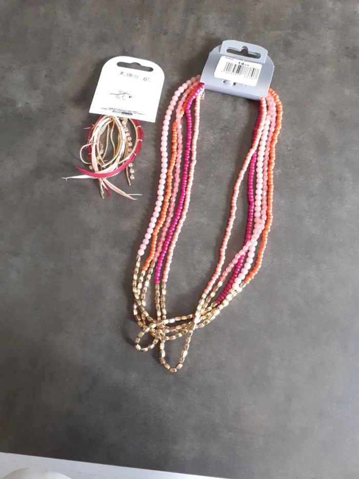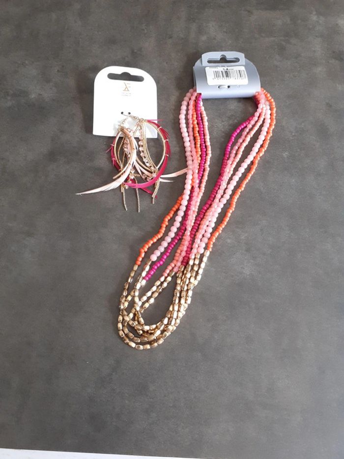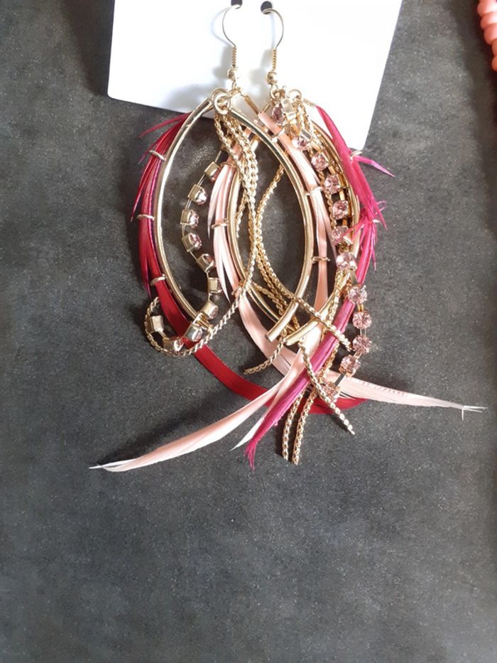 Jamais porté. Boucles pour oreilles percées. Plumes un peu écartées Collier, réglable