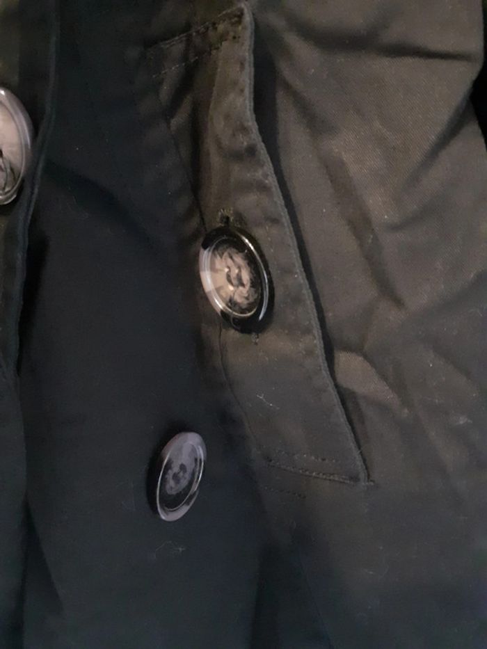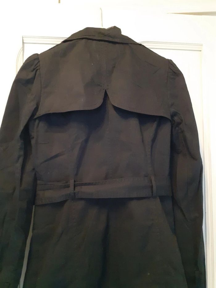 A été porté, bonne état. 2 poches cavalières. Ceinture. Gros boutons. Intérieur 100%polyester Extérieur 100%coton