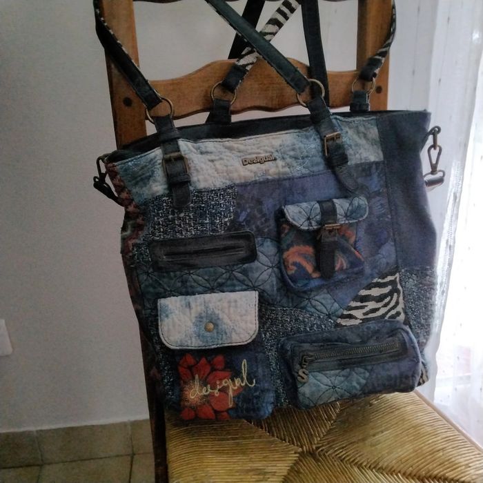 Grand sac à main DESIGUAL Avec 2 poignées et 1 bandoulière 4 petites poches devant 2 petites poches zippées à l’ intérieur Fermeture eclair impeccable Hauteur : 33 cm Longueur : 33 cm Profondeur : 14 cm