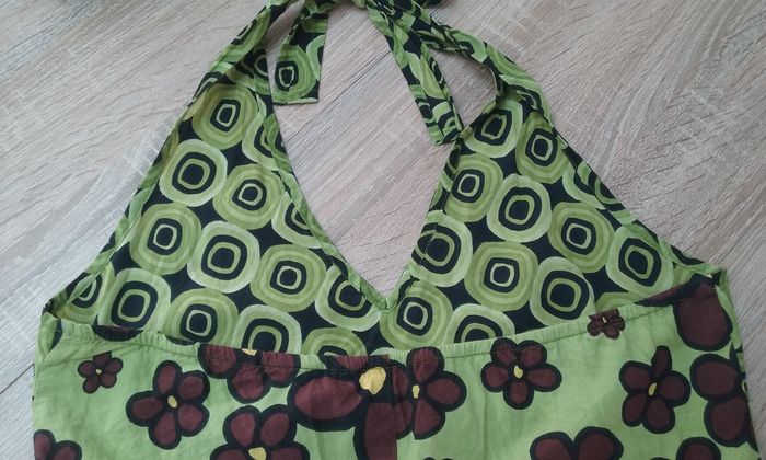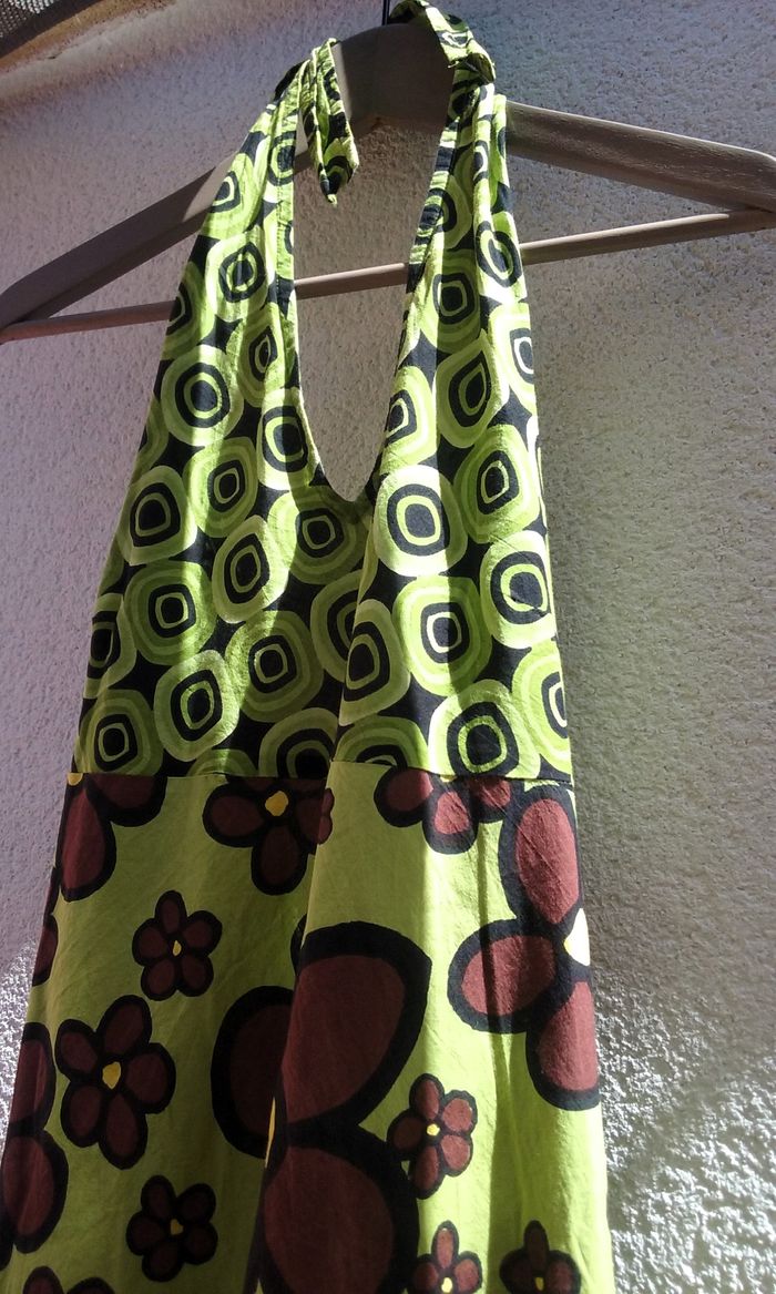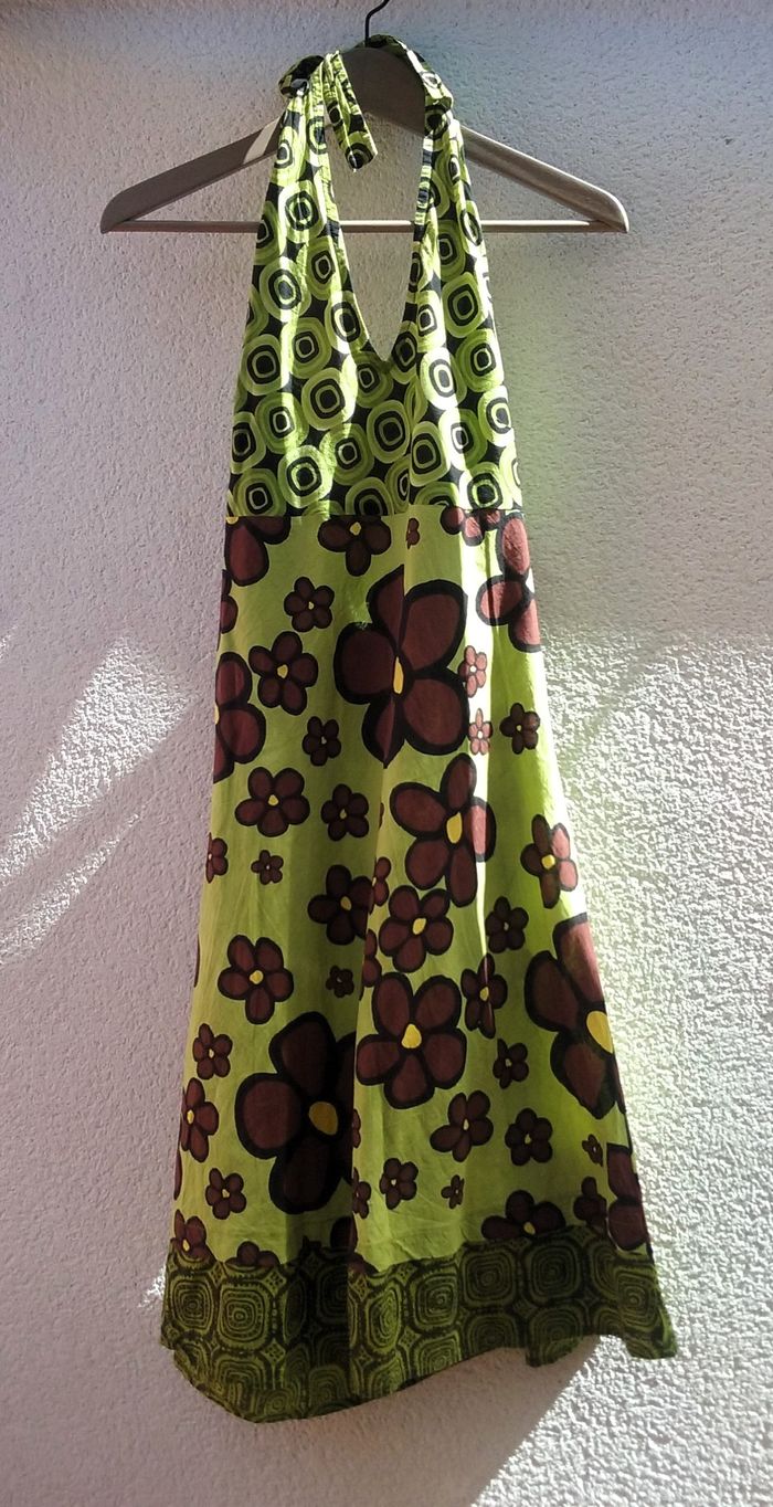 Très jolie robe agréable à porter, aux couleurs acidulées (vert anis, jaune citron)! 100% coton, comme neuve!
