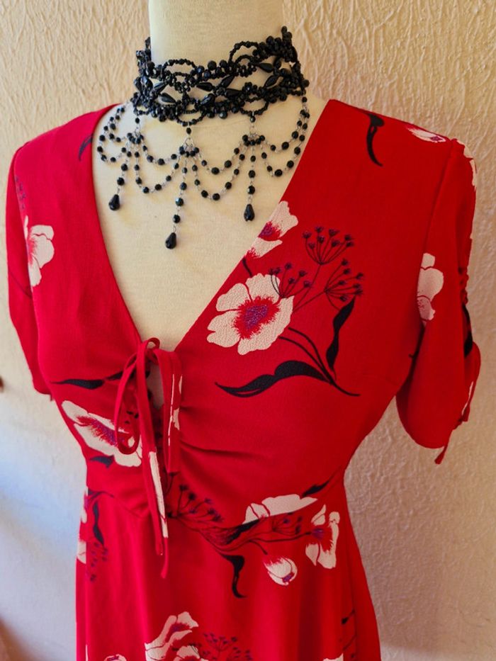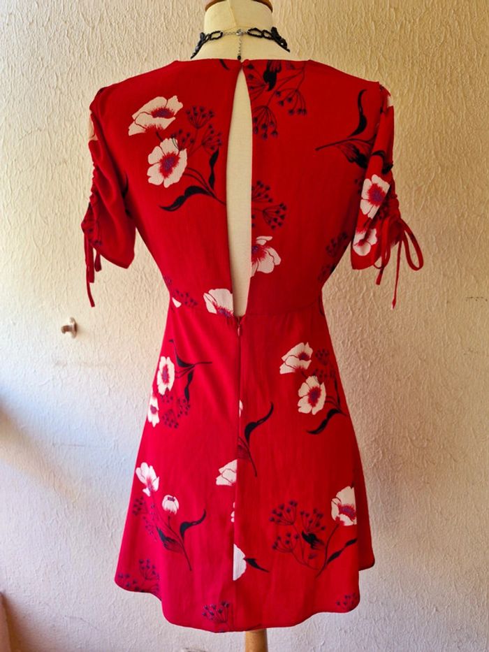 Magnifique robe Mango Fond rouge motifs fleurs Bouton niveau nuque et zip en bas Ouverte au dos