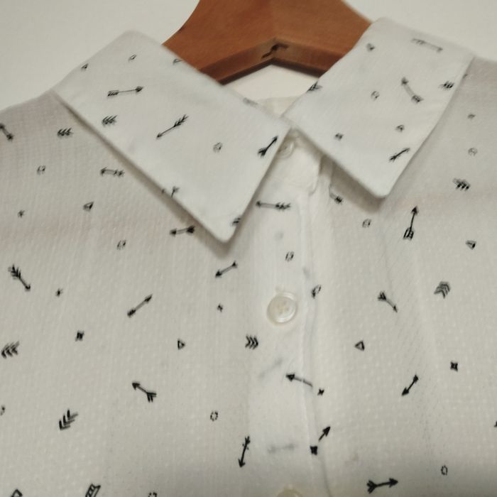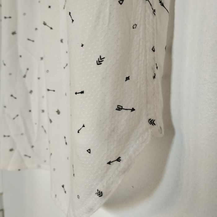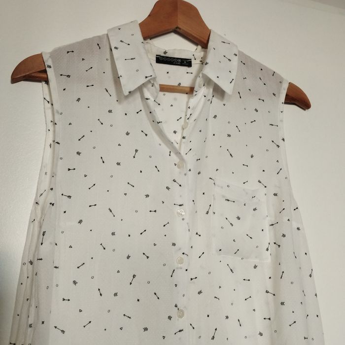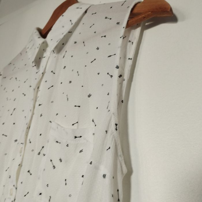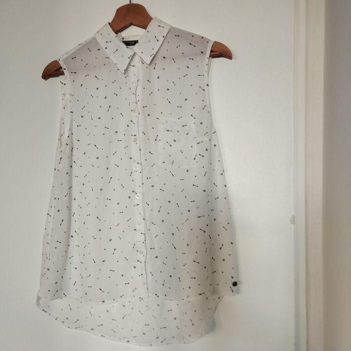 Chemisier femme Taille 38 sans manche, plus long à l'arrière forme liquette, longueur devant 55cm, l'arrière 63cm. De chez Bonobo