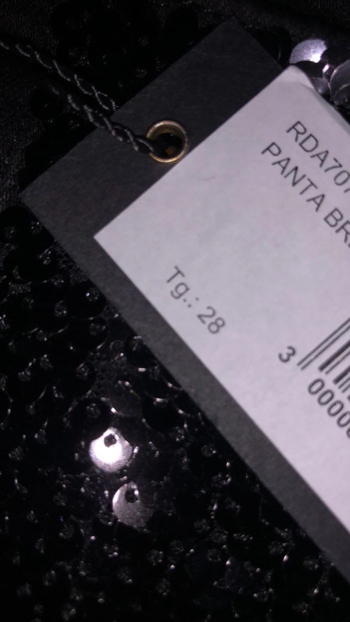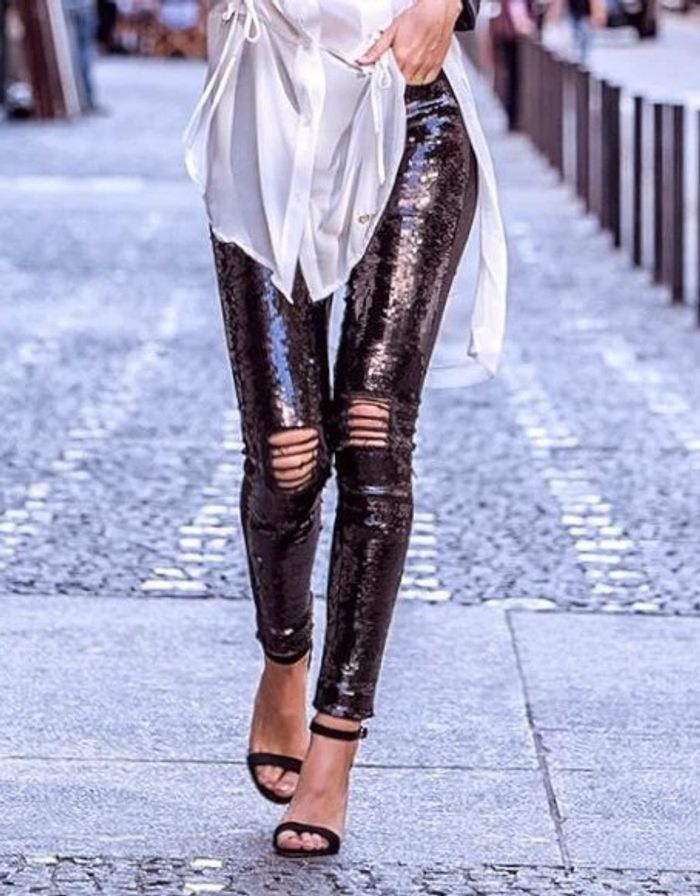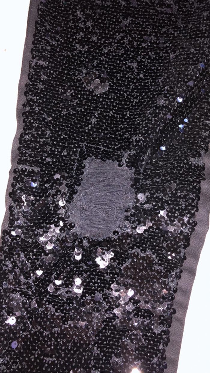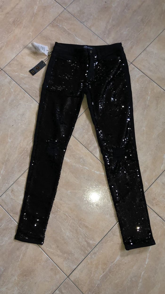 Jeans avec des sequins devant et un effet sur les genoux