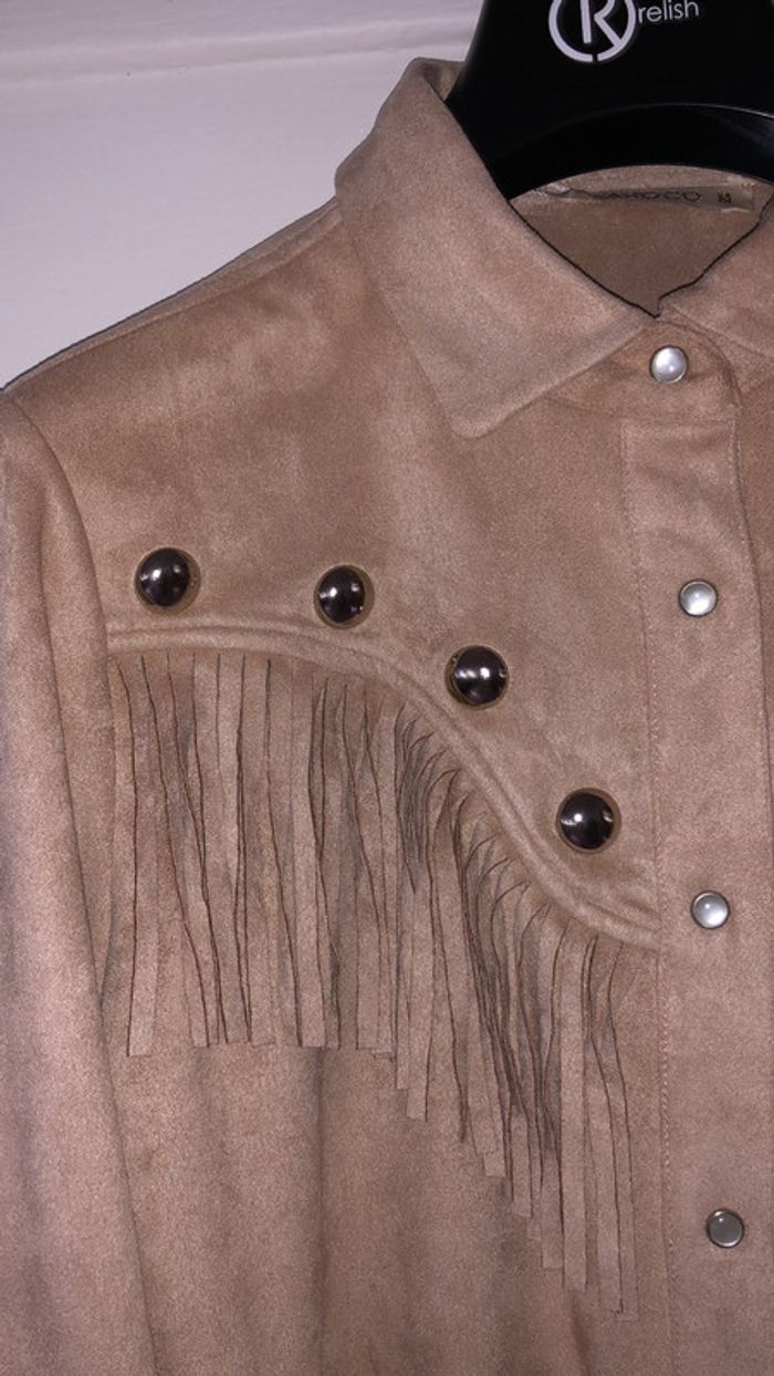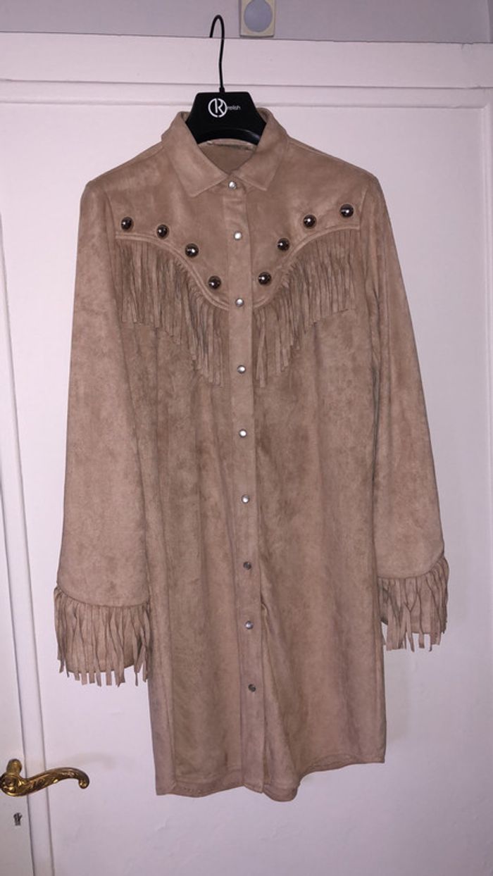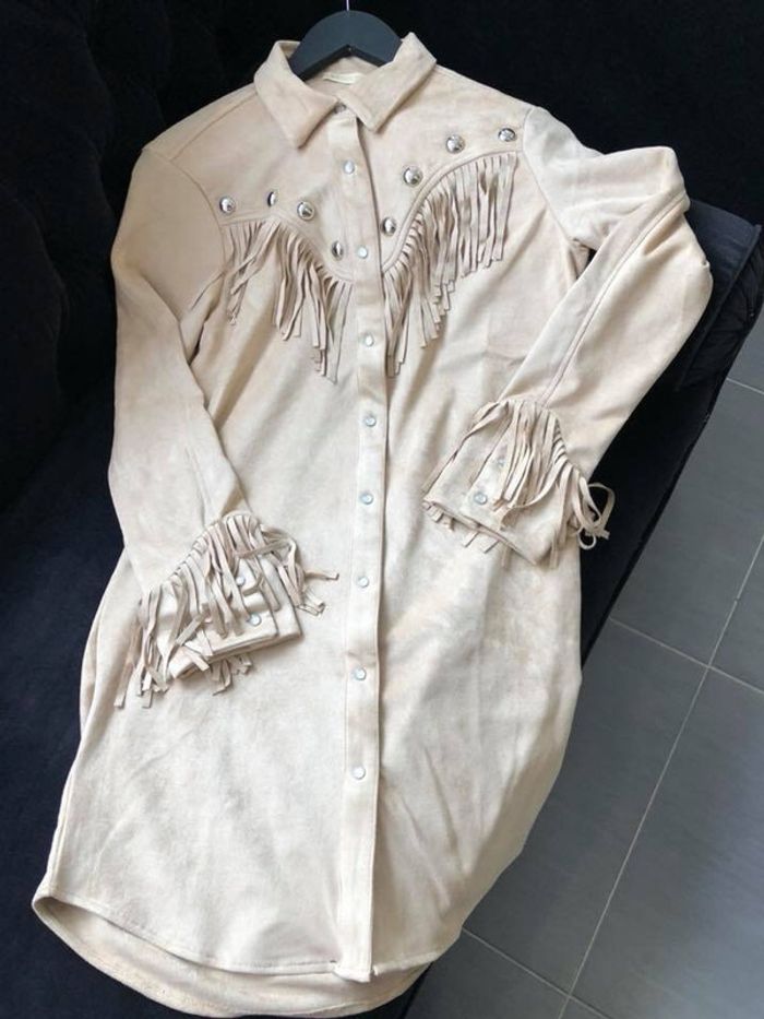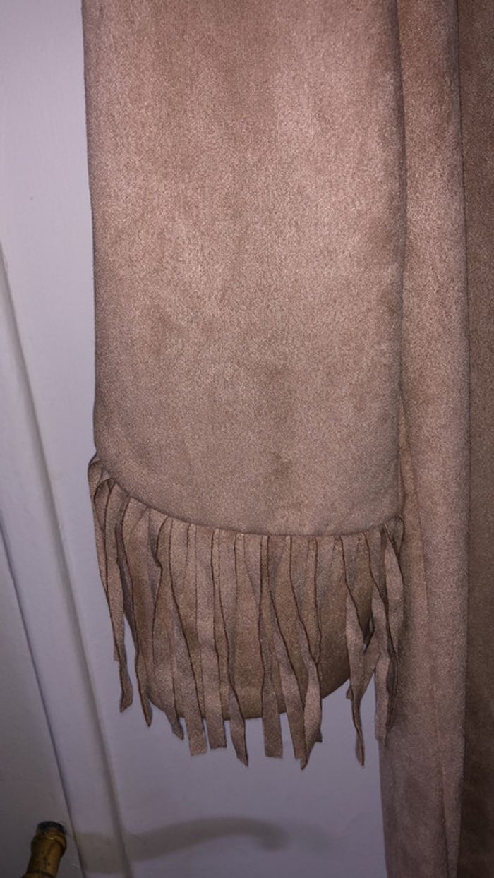 robe en peau de pêche très agréable au toucher d’une grande marque très à la mode avec ses franges et ses clous