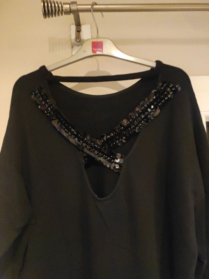 Robe noire hivers manches longues , joli encolure dos en sequins . Taille M sur l'étiquette, mais plutôt L