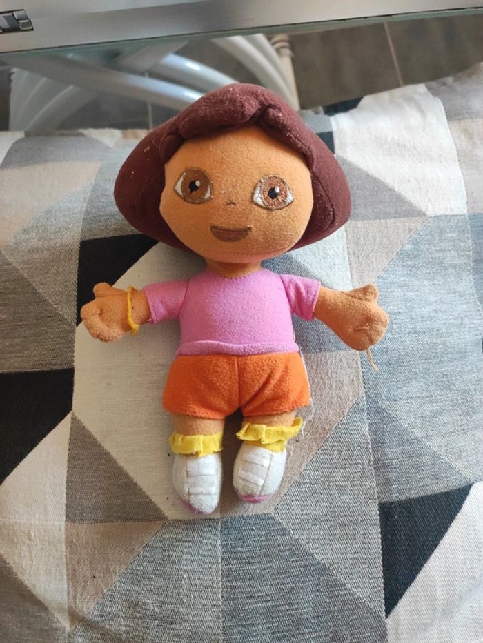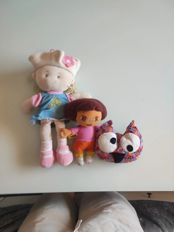 Lot de 3 peluches , une petite fille, une Dora l'exploratrice et une tête de chouette