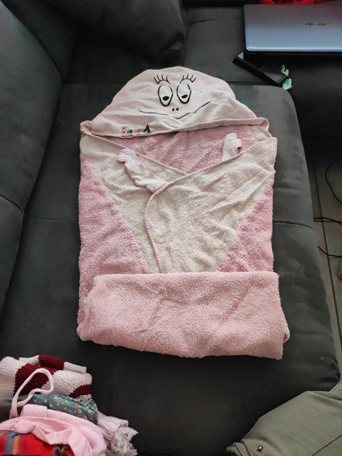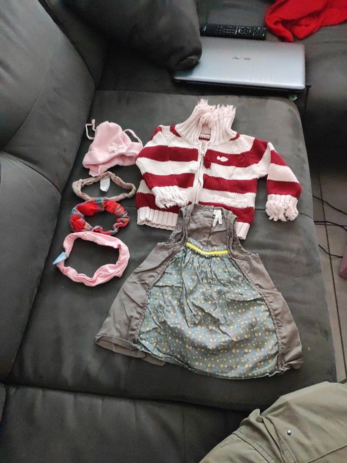 Lot pour bébé fille de 6 mois se composant d'une serviette capuche Barbapapa, d'un gilet" effet mer" , d'une robe orchestra, de 3 bandeaux et d'un bonnet