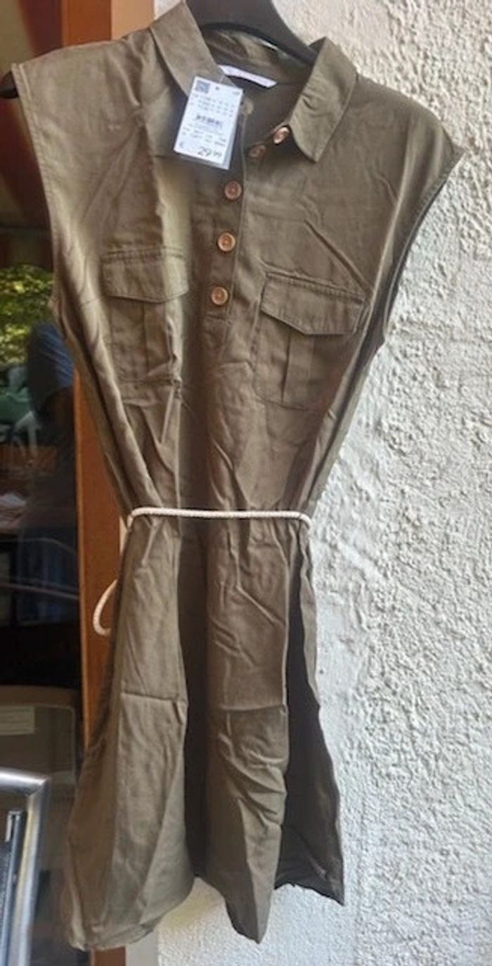 Robe avec lien à cordes. Coupe droite Col chemisier avec patte boutonnée jusqu'à la poitrine 2 poches poitrine à rabat Sans manches Longueur genoux Composition : 100% lyocell Taille : 38 Coloris : kaki Prix : 13€ #sisterkayafemmet38 Réf : b.ii +1