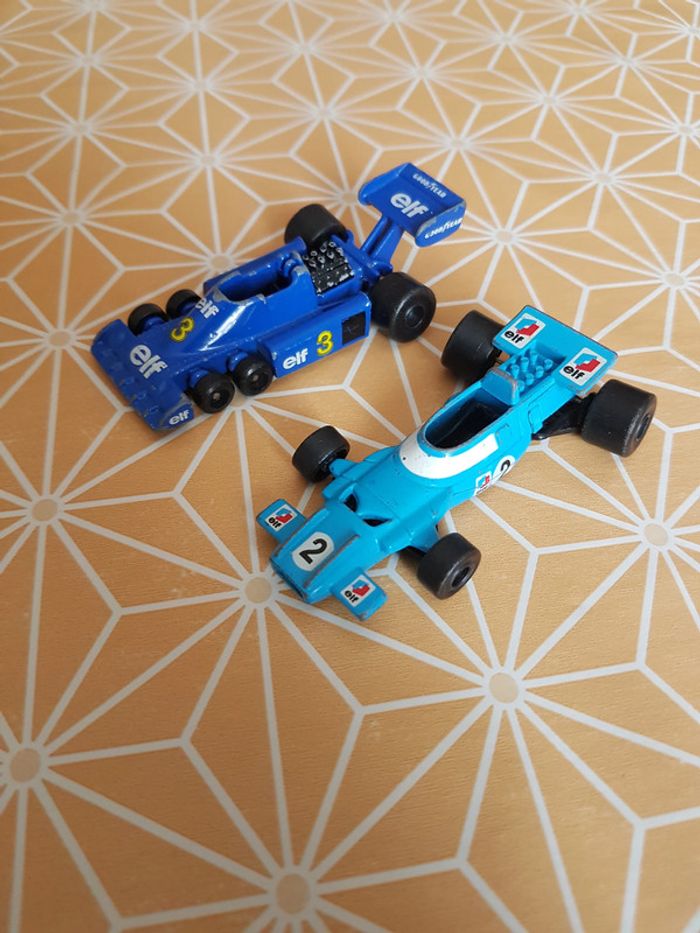Petites voitures de course Elf 2 et 3 ELF TYRELLE F1 bleu métallique ELF MATRA MS80 bleu ciel Voitures qui roulent, extérieur un peu abîmé #SILVERSYNjeux