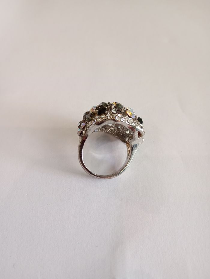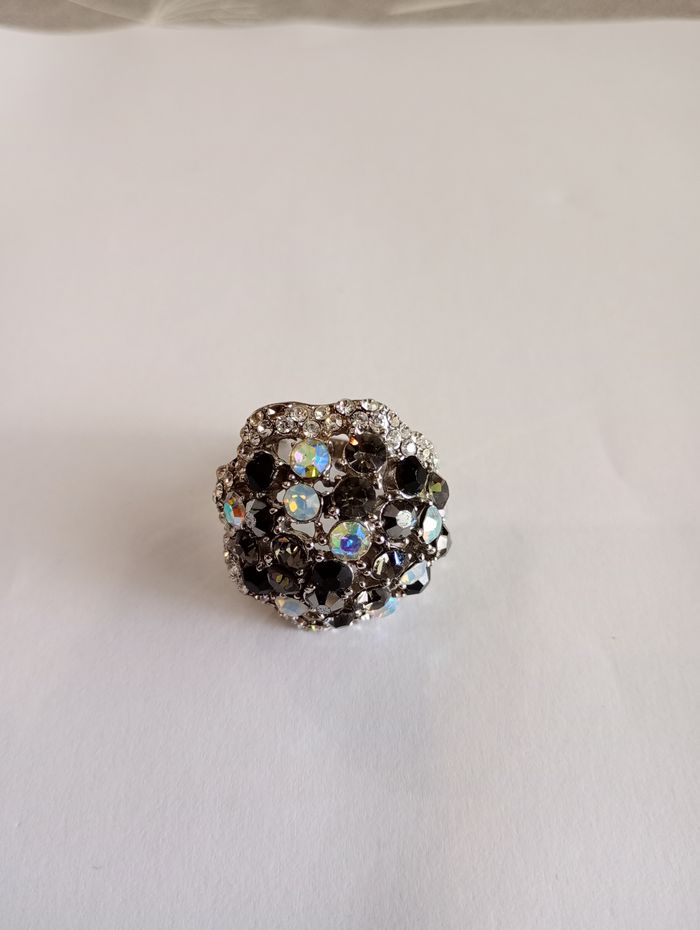 Bague avec plusieurs strass blancs gris et noirs. Quelques petits diamants autour ne sont plus là 19 mm Très bon état.