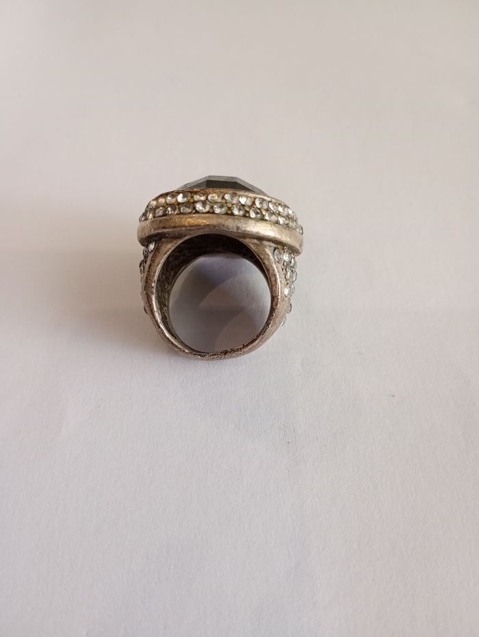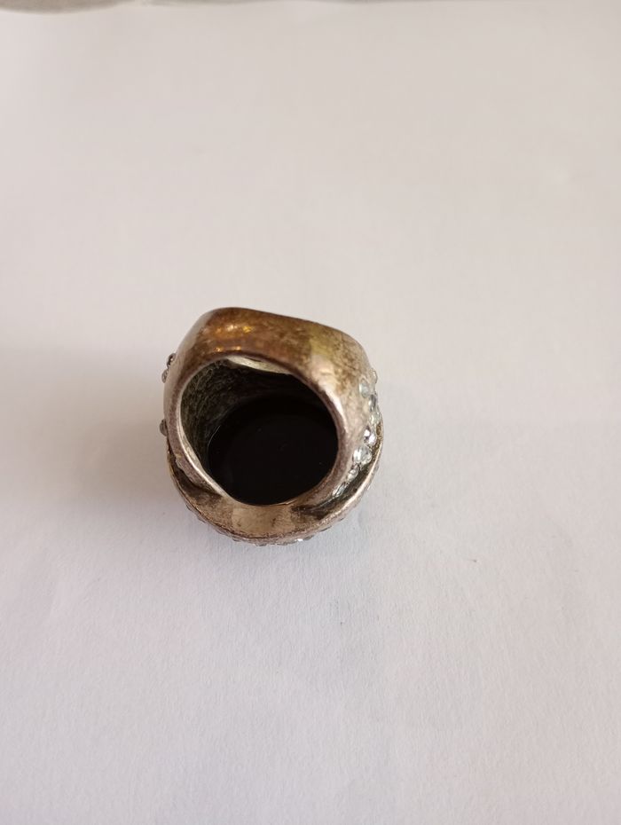Bague avec grosse pierre noire sertie de strass. Effet métal vieilli. 17 mm. Très bon état.